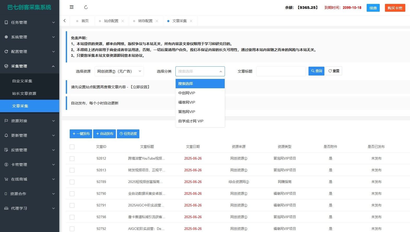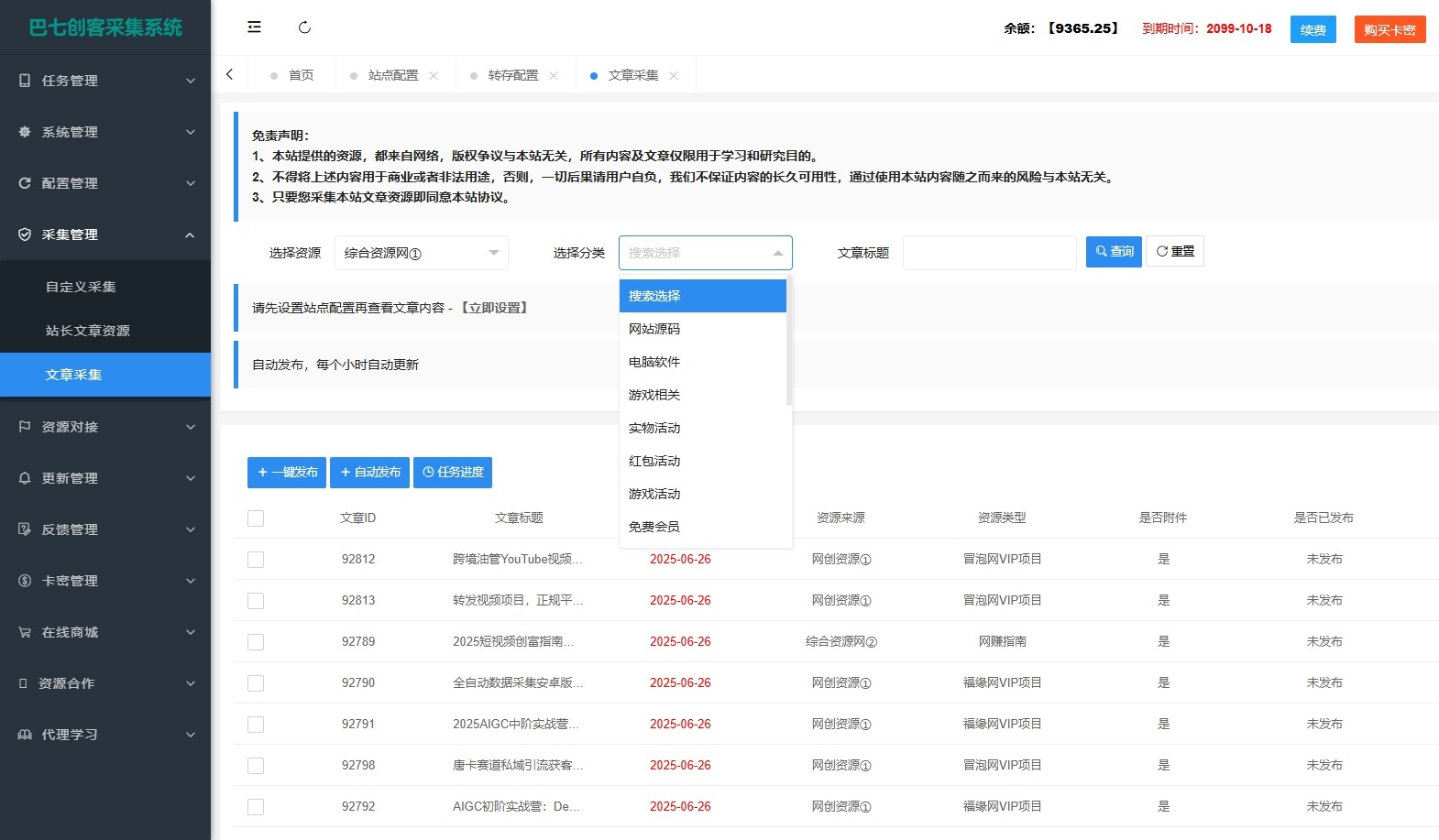 内置福缘社区、中创论坛、冒泡网、自学成才四大高价值网创资源站点采集模块,同时扩展支持游戏资源、开源源码、电商活动线报等垂直领域内容抓取。