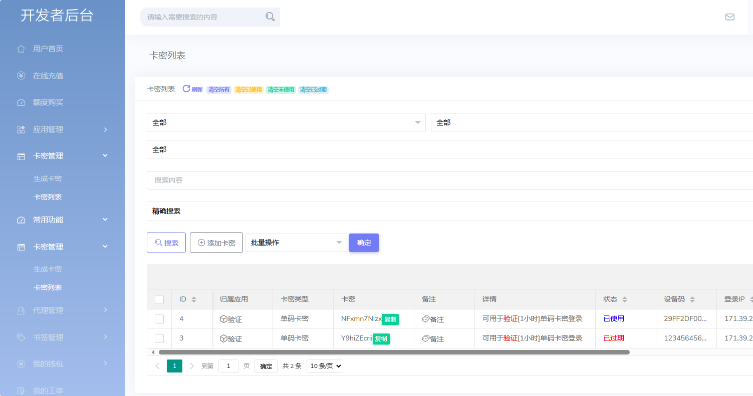系统配备完整的后台管理系统,支持自主发卡、解绑设备、封禁异常卡片等操作。