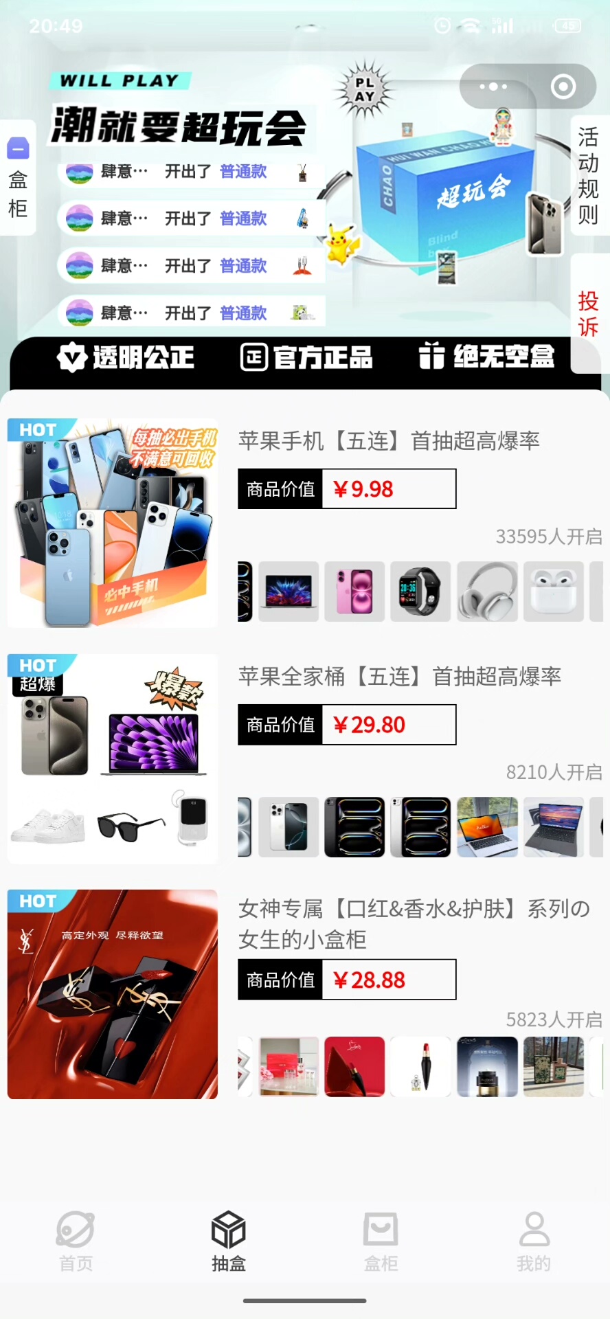后端采用高性能PHP框架Laravel构建,具备高并发处理能力与完善权限管理;前端基于UniApp跨平台框架开发,兼容微信小程序、H5及App,UI界面由资深设计师打磨,视觉清新、动效流畅,极大增强用户抽盒沉浸感与信任感。