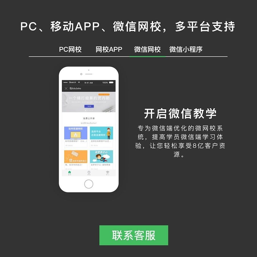 EduSoho在线教育系统全面适配微信公众号、微信小程序、响应式官网、原生移动App及平板电脑,真正实现用户数据、课程进度、学习记录、订单信息跨平台实时同步,告别多端割裂体验。