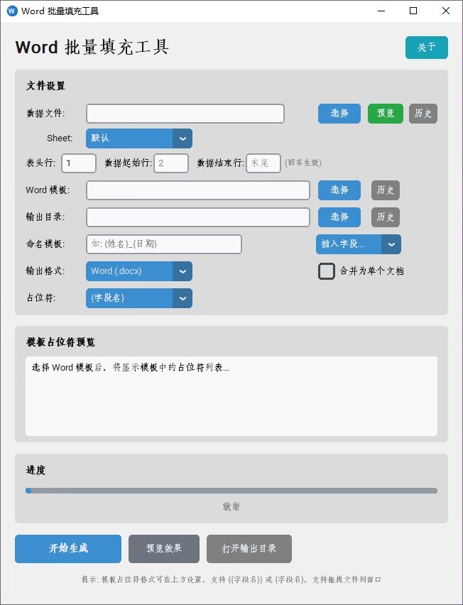 支持从标准Excel文件(.xlsx/.xls)中读取任意行列数据,并按预设占位符(如{{姓名}}、{{编号}})自动映射填充至单个Word模板中。