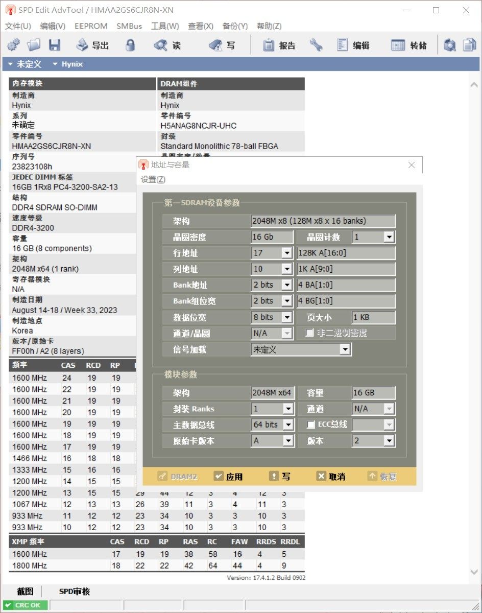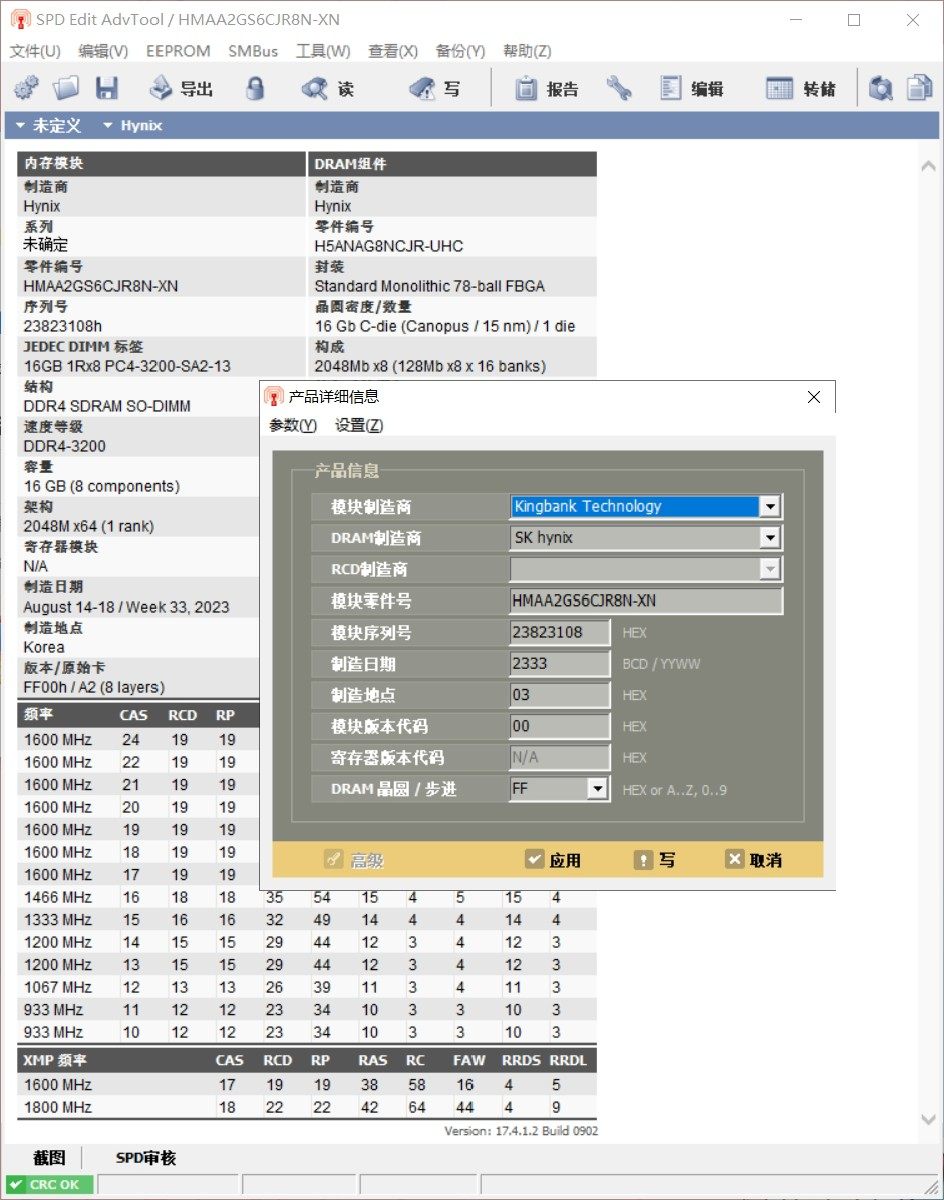 支持完整SPD字段自定义:包括但不限于内存品牌名称、制造商ID、生产日期(Year/Week)、颗粒型号、序列号(Serial Number)、标称容量(Capacity)等基础信息;同时可精细调节JEDEC标准频率、CL/tRCD/tRP/tRAS等关键时序、二级小参(Secondary Timings),并支持添加/覆盖XMP 2.0/3.0或AMD EXPO配置文件,以及动态调整工作电压(VDD/VDDQ/VPP)。