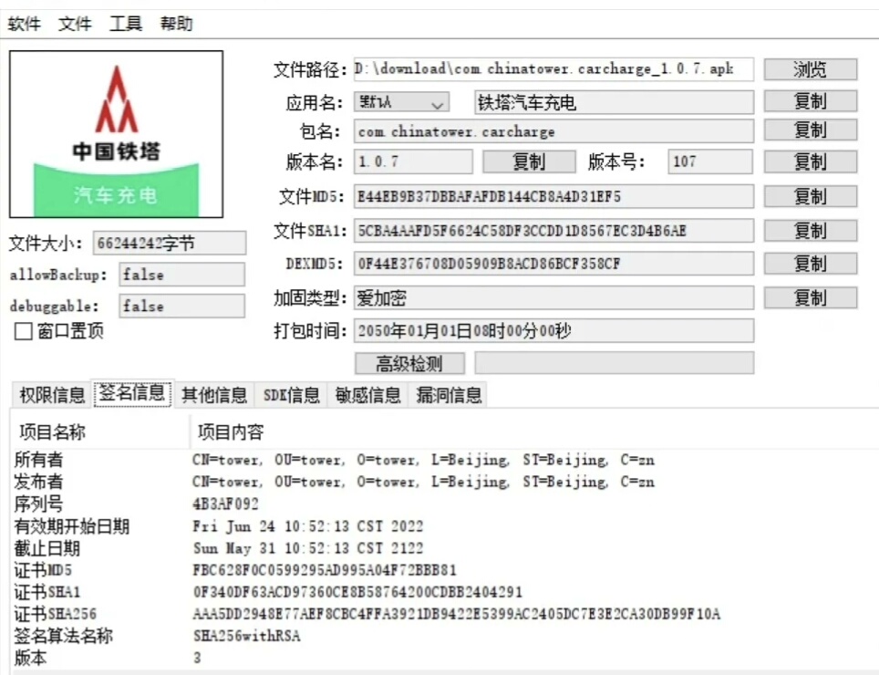 支持全自动提取应用基础元数据:包括完整包名(packageName)、可读版本名称(versionName)与内部版本码(versionCode)、数字签名(Signature)摘要、安装包文件MD5校验值;同时智能识别并结构化输出内嵌SDK列表、硬编码URL链接、网络请求配置及潜在敏感字符串,助力安全团队快速掌握APP技术栈与攻击面。