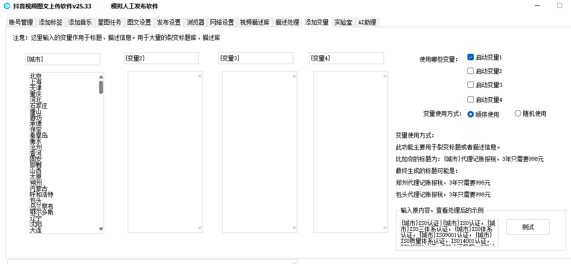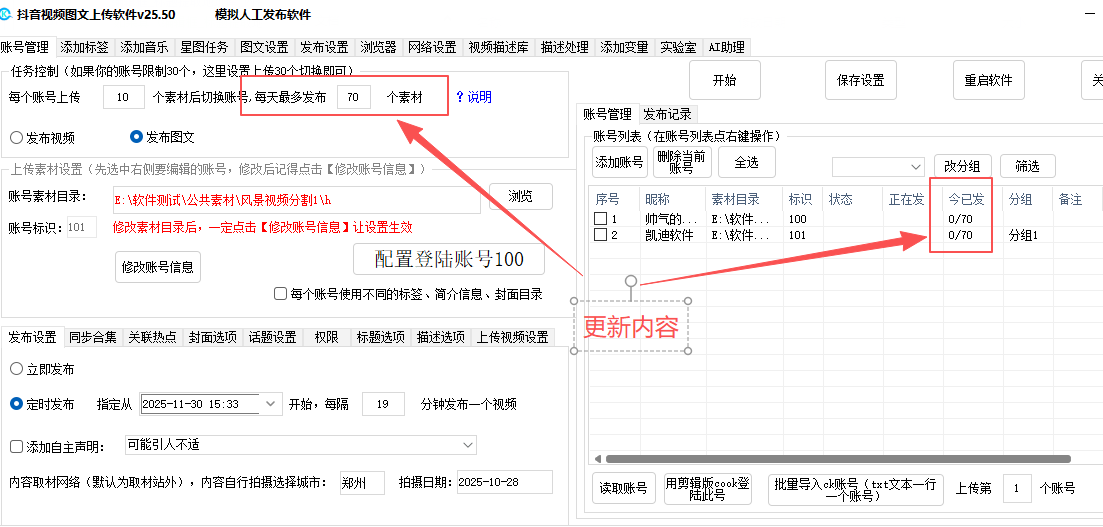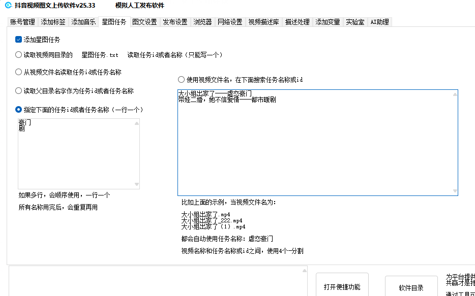 每个任务均可独立设置:账号专属标识、结构化素材目录、高清自定义封面、精准话题标签(#)、吸睛标题文案等。