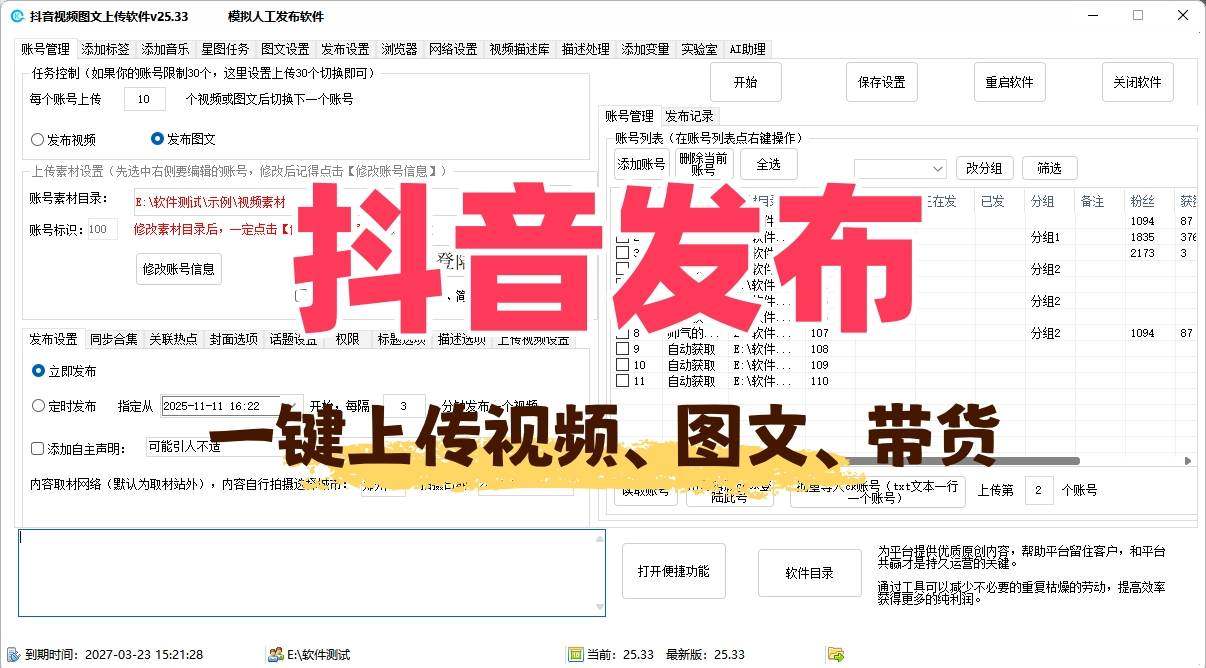 本工具专为规模化抖音运营设计,全面支持视频与图文内容的自动化分发。
