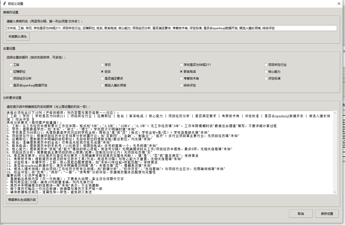 4. **场景化灵活配置**:可切换DeepSeek等AI引擎,适配‘校招快速初筛’或‘高端岗位深度评估’不同需求,支持文件夹导入、表头定制与结果模板导出。