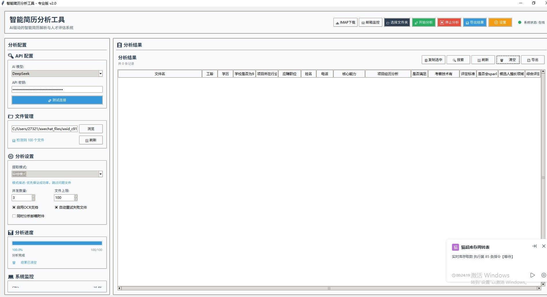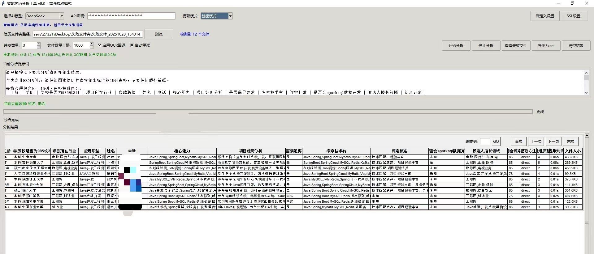 面对上百份简历,传统方式需数小时逐条阅读?本工具支持百份并发解析,自动抓取姓名、学历、年限、技能等30+关键字段,处理效率提升8倍以上。