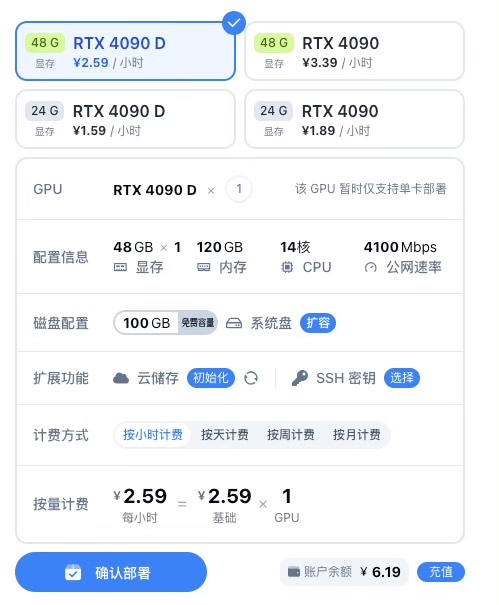 后续按实际使用时长计费:搭载满血版RTX 4090D的实例每小时仅2.59元,旗舰RTX 4090实例每小时3.39元,关机即停计费,真正做到用多少付多少。