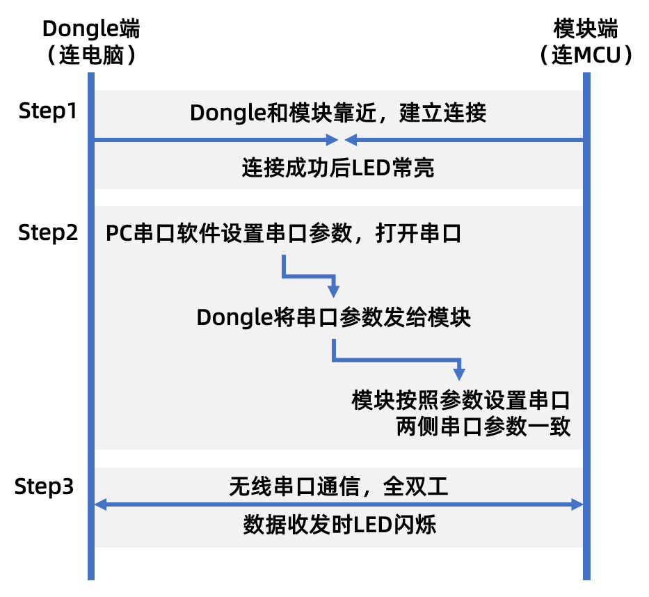 第一步:将USB Dongle插入电脑任一USB接口;第二步:为串口模块端提供3.3V或5V供电(由目标板引出),并确保其与Dongle间距≤1.5m;第三步:模块指示灯常亮即表示无线链路已建立,后续在任意串口调试软件(如XCOM、SecureCRT)中按常规串口方式配置参数即可使用。
