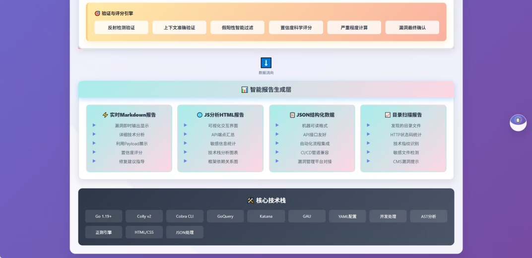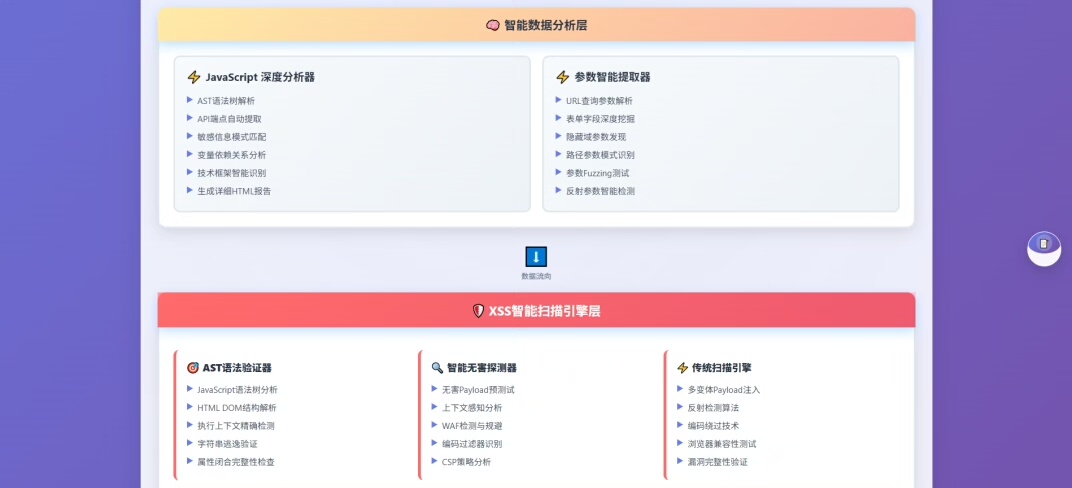 它并非单一功能插件,而是深度融合四大能力模块——高适应性智能爬虫、精准XSS跨站脚本检测引擎、基于抽象语法树(AST)的前端JS代码深度分析,以及结构化自动报告生成系统。