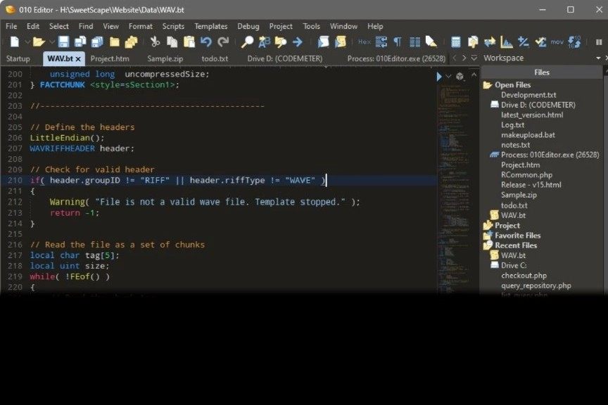 通过集成Tree-sitter技术,010Editor实现了对多种编程语言的实时语法分析,这使得无论是简单的文本文件还是复杂的XML、HTML文档,甚至是C/C++源代码或PHP脚本,都能够得到准确而高效的编辑体验。