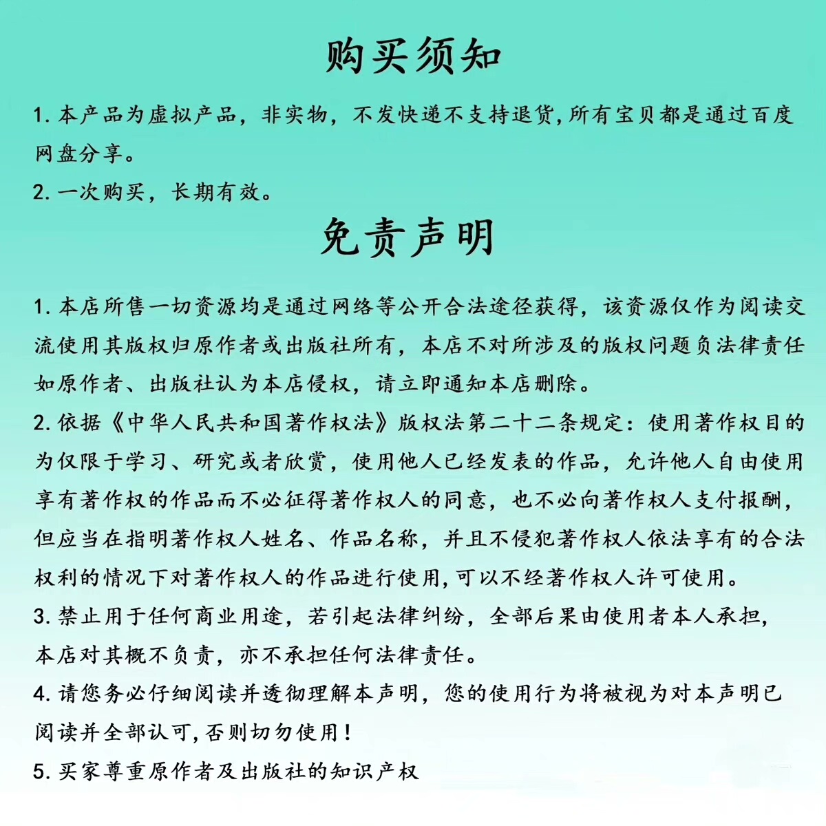 请注意,由于本产品具有易于复制传播的特点,一旦售出概不退换,请您理解。