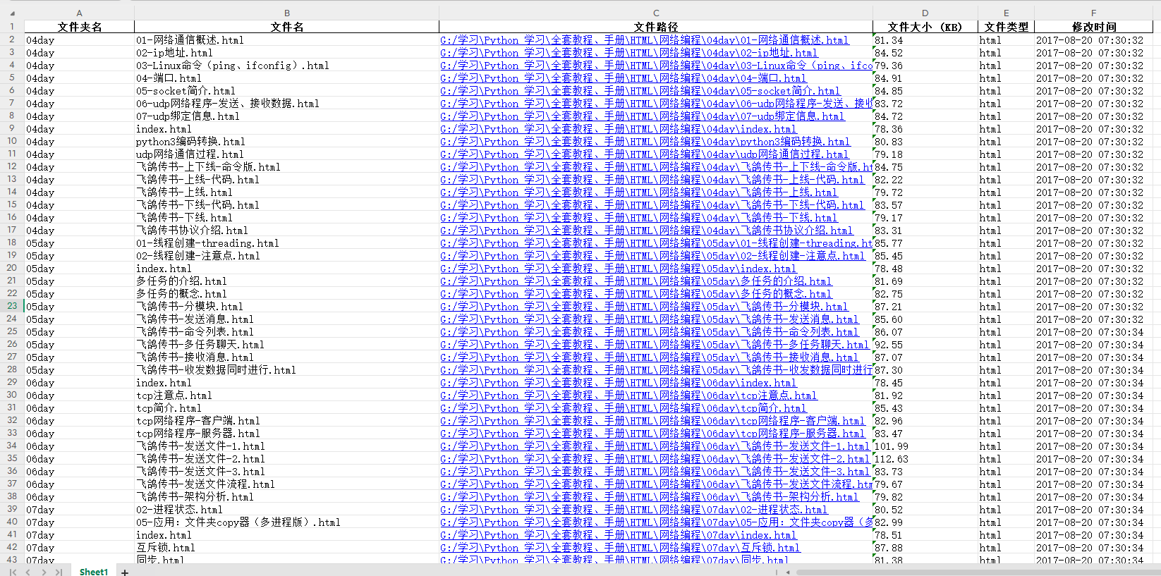 生成的Excel清单包含多项关键信息:所属文件夹名称、原始文件名、完整文件路径(支持点击直达)、文件大小(自动换算为KB单位)、文件类型(基于后缀识别)以及精确到秒的最后修改时间,便于后续审计、版本控制和分类管理。