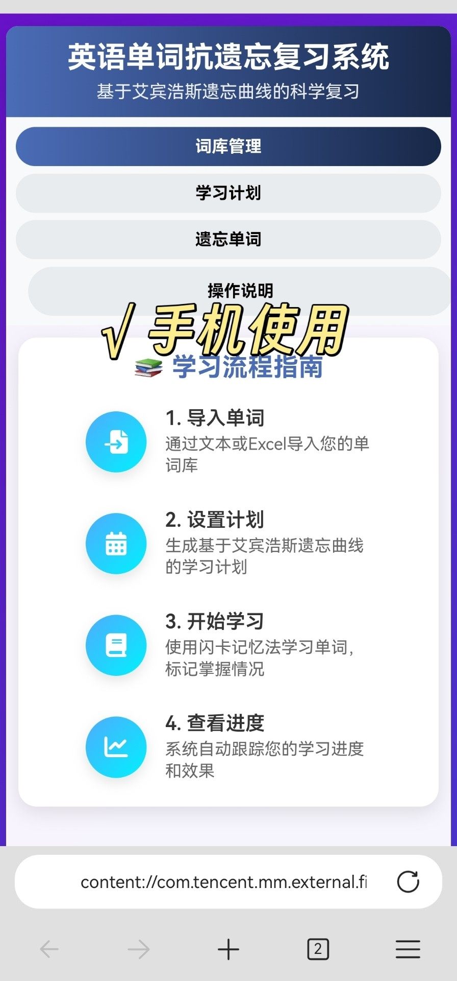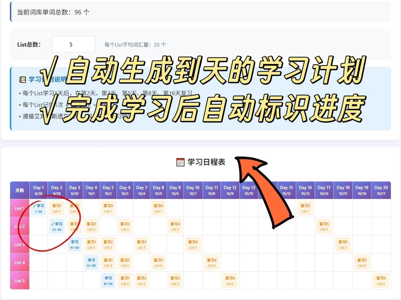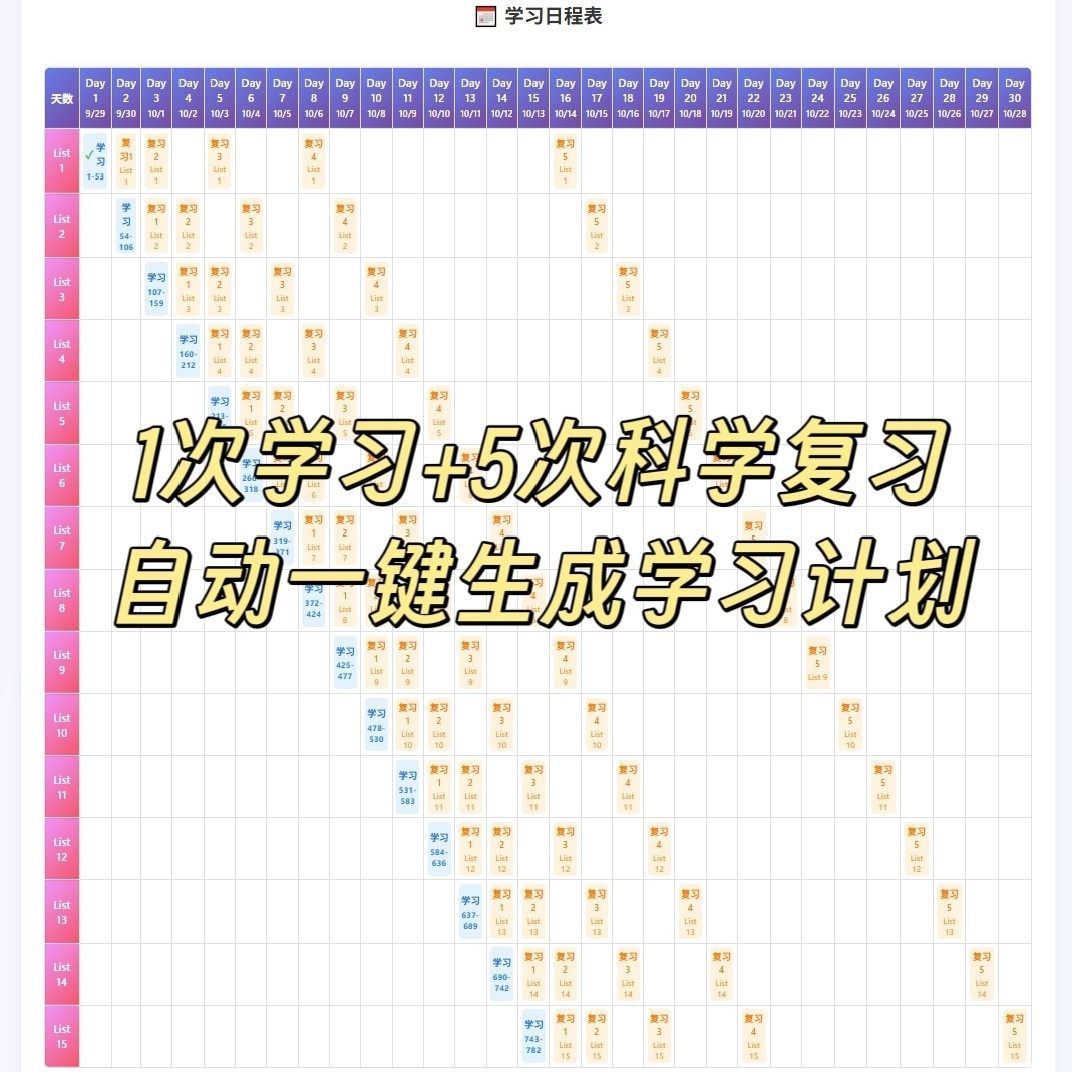 - **智能化日程安排**:无需手动设定复杂的复习流程表,只需将所需学习的词汇列表导入软件内,系统会自动为你创建出最佳的学习路线图。