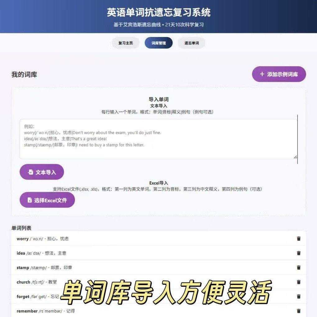 - **灵活词库管理**:允许用户以文本或Excel格式批量上传自己的个性化词汇集,涵盖从基础教育阶段到高等教育乃至专业考试如四六级、考研、雅思托福等各个层次。