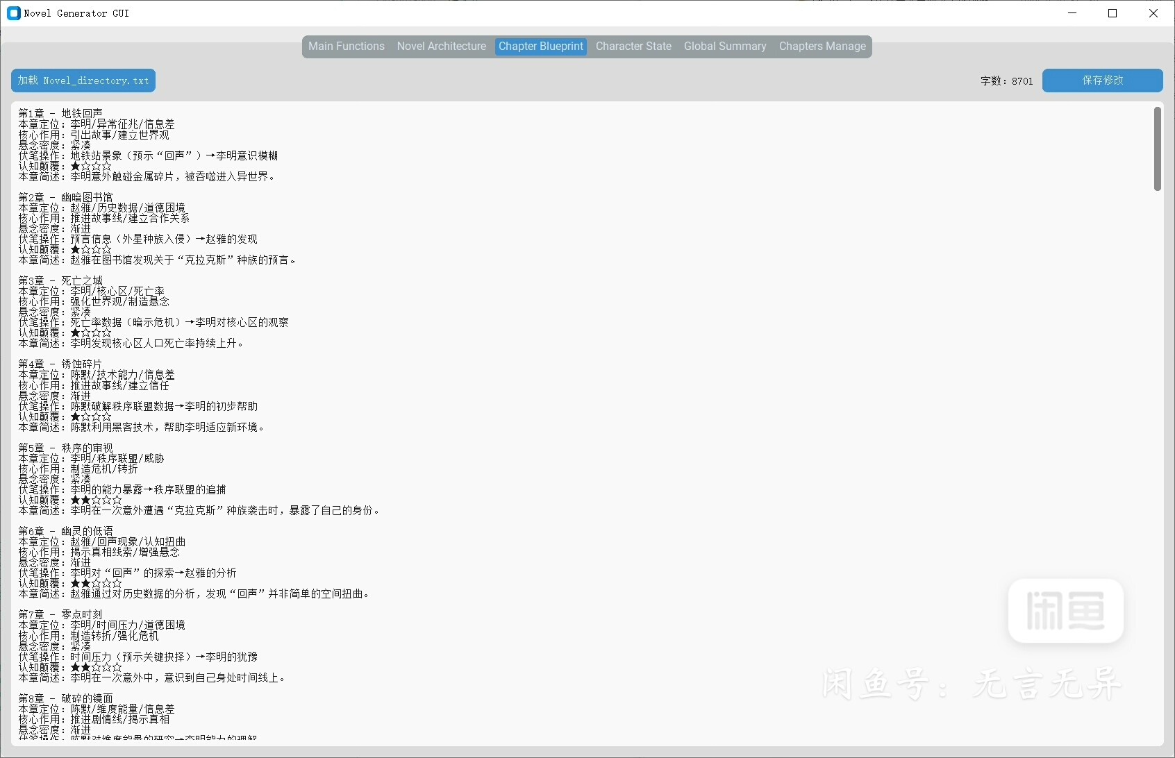 - **角色追踪体系**:持续记录并更新人物状态,助力塑造鲜活立体的人物形象。