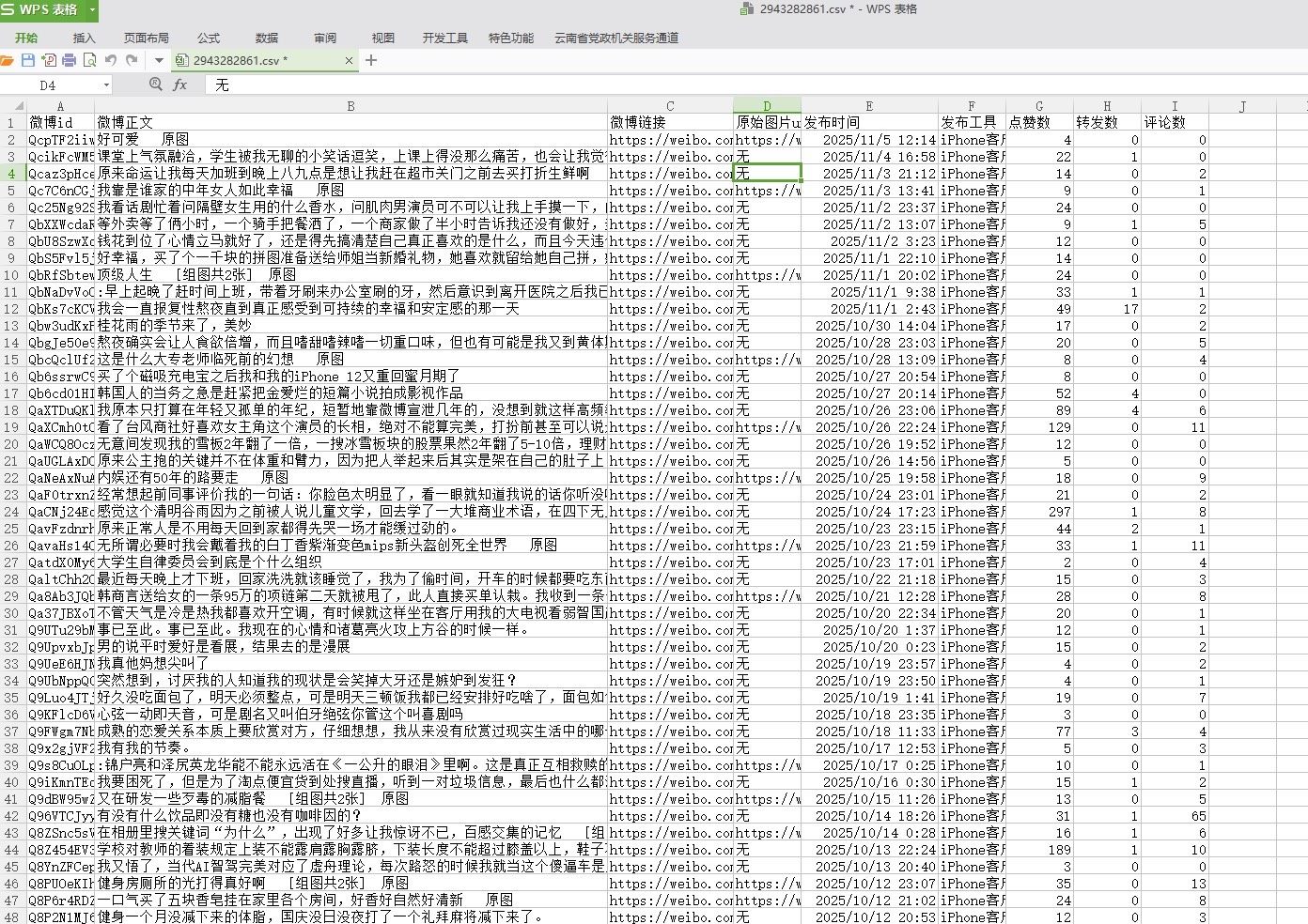 当您启动一个采集任务时,系统会在当前文件夹下自动生成一个包含13个不同维度信息(如博主ID、微博正文、微博链接等)的CSV格式结果文件。