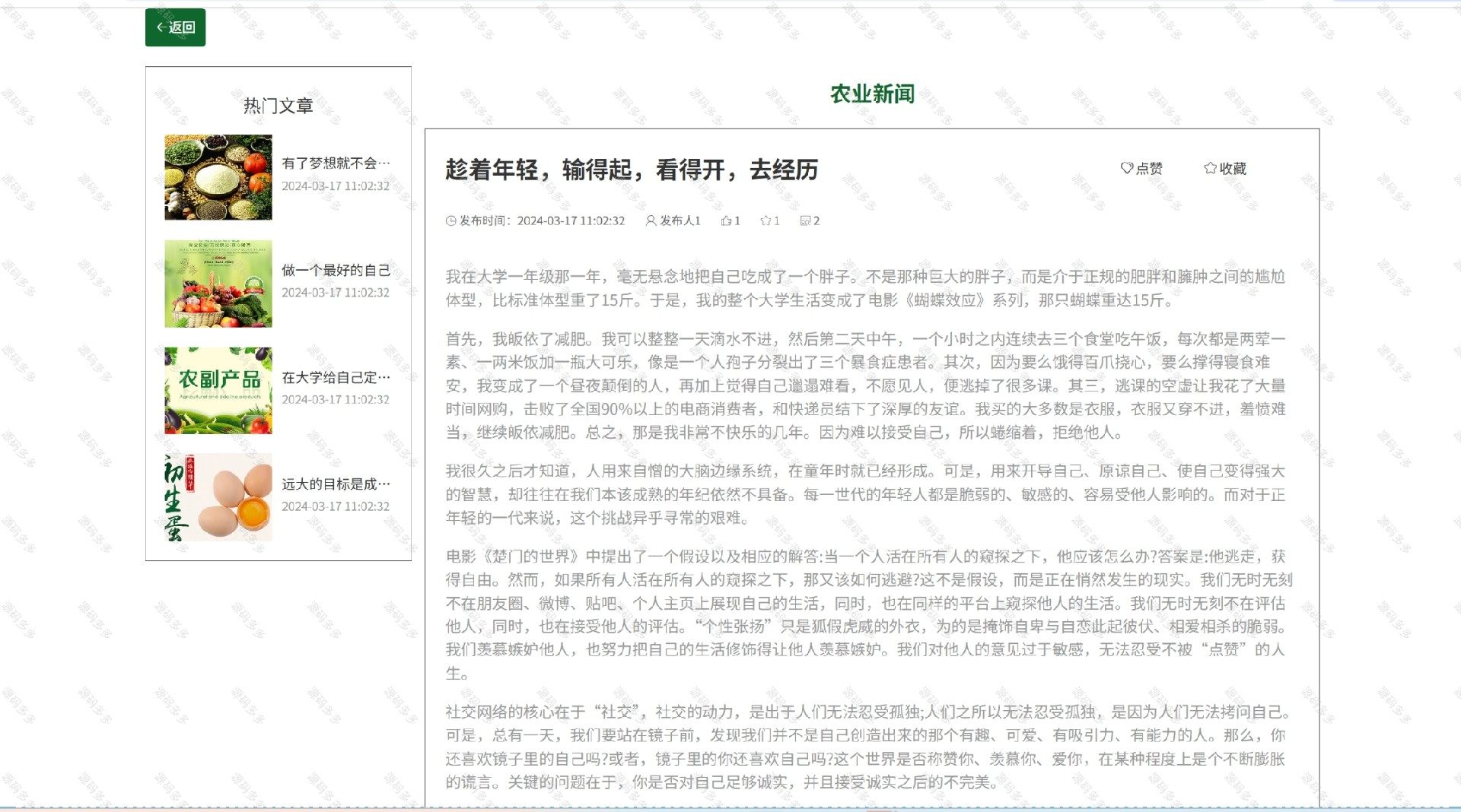 - 农户功能:首页浏览、专家咨询、知识区、天气预报服务、社区讨论区及最新农业资讯推送。