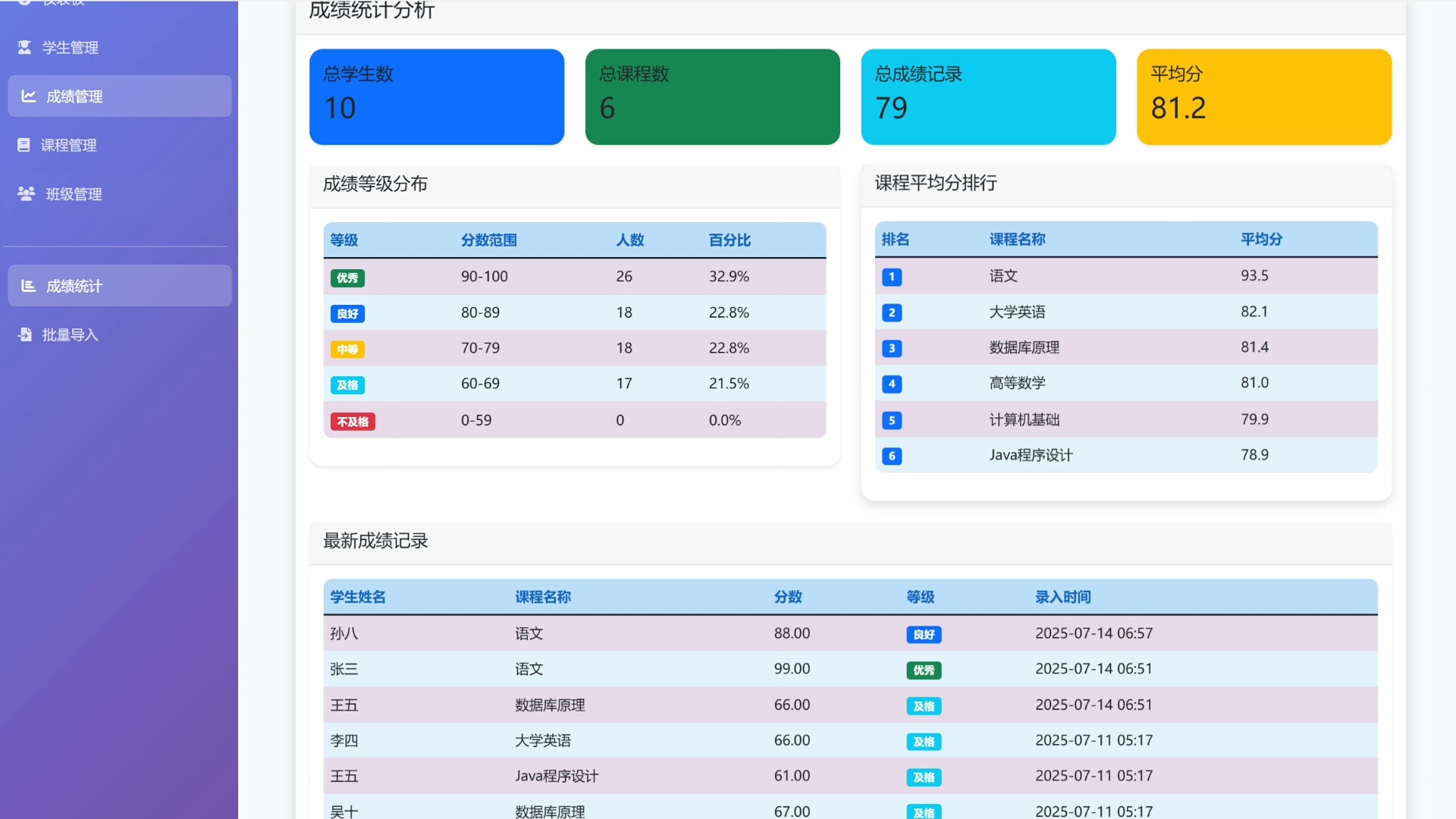 系统提供全面的成绩管理能力,包括学生信息维护、班级设置、课程管理以及成绩录入与查询。