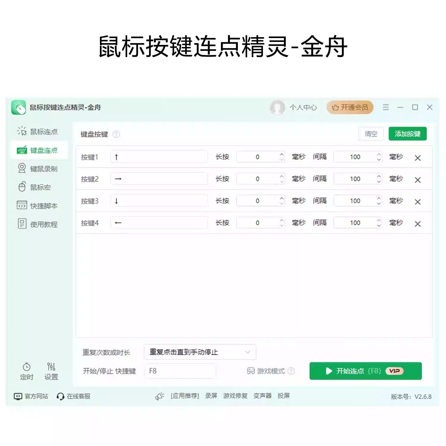 2. **键盘重复触发**:允许设定特定字母键或者组合键作为触发对象,并可调整按下持续时间和间隔时间以满足不同需求。