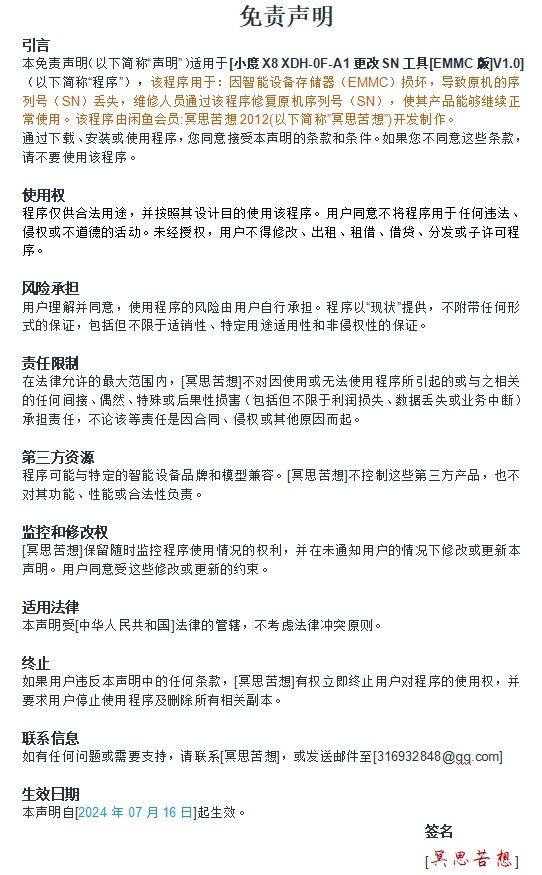 本文档旨在说明[小度X8 XDH-0F-A1 EMMC版SN修改工具V1.0](简称“应用”)的相关免责条款。