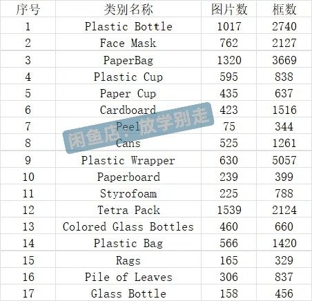 此套装包含7542幅带有XML和TXT格式标注的图片,覆盖了包括塑料瓶、口罩、纸袋等在内的17种常见路面废弃物类别。