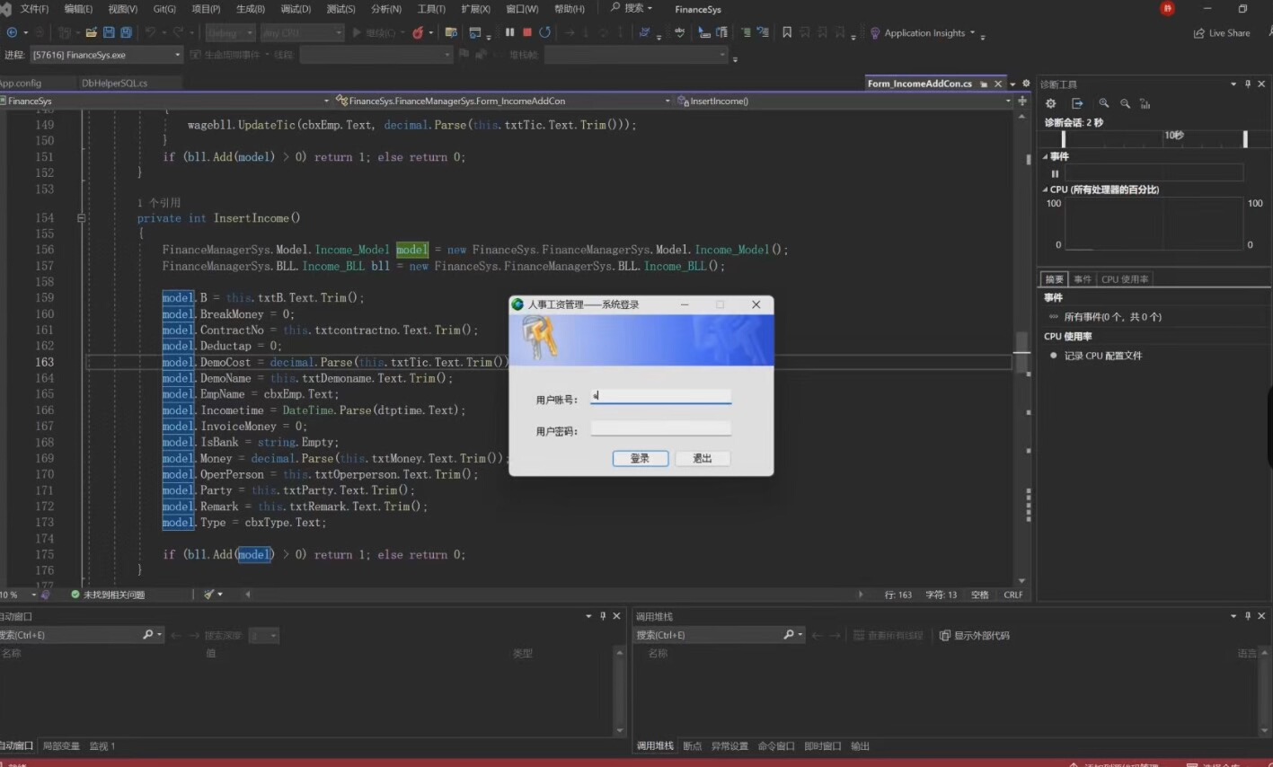 后端使用SQL Server数据库进行数据存储,表结构设计合理,包含员工表、部门表、工资明细表、用户权限表等,通过ADO.NET实现高效的数据访问。