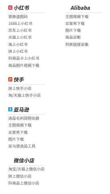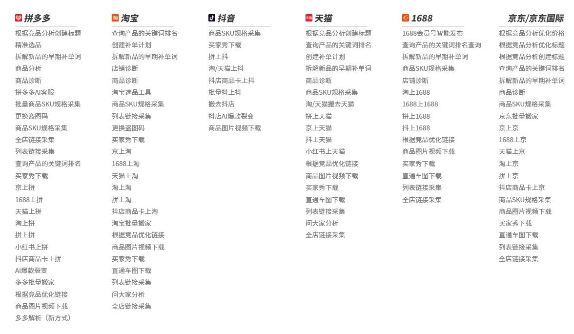 全家桶会员享有每日600次的服务额度,能够轻松地在拼多多、抖音小店、淘宝、天猫、阿里巴巴(1688)、京东、小红书、快手以及微信小程序等主流电商平台上进行商品信息的采集和。