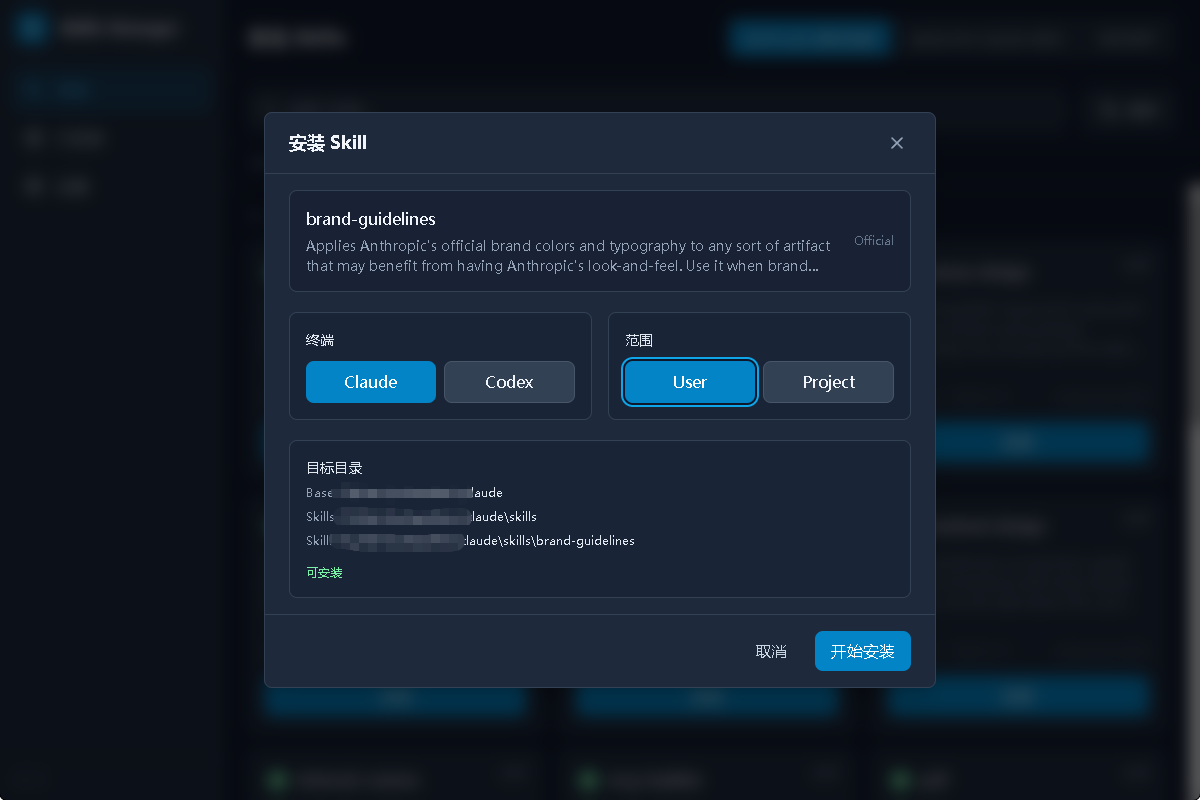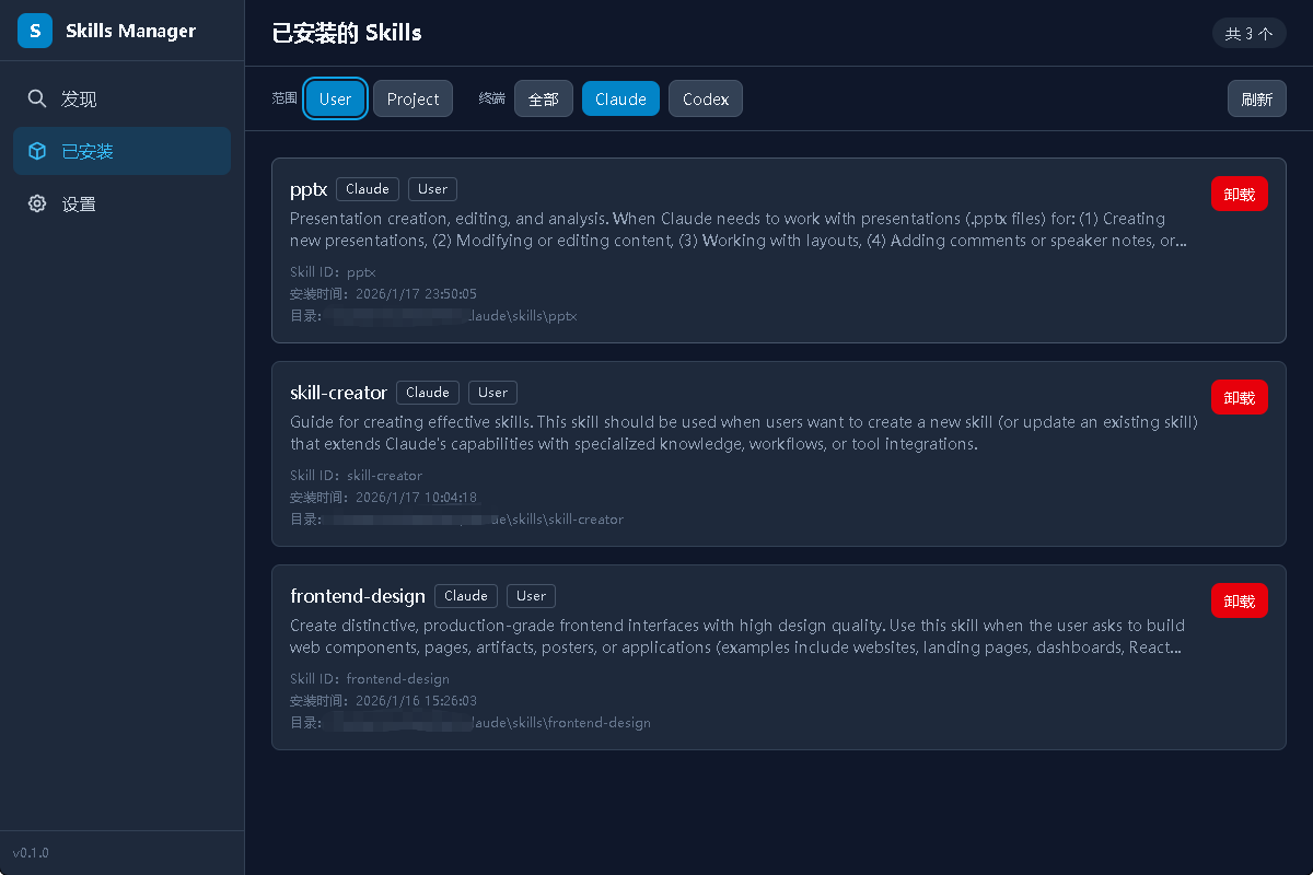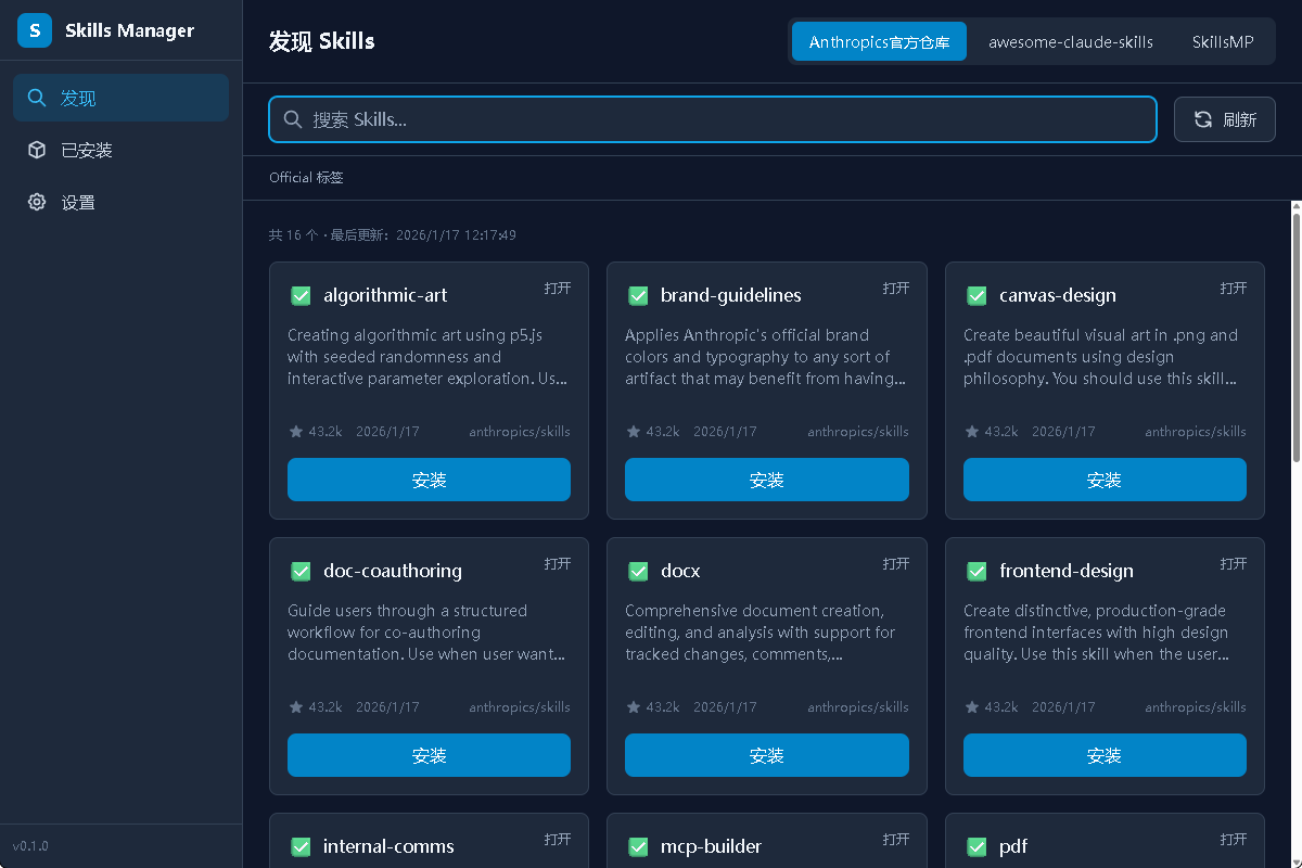 1. 启动程序 → 2. 查找并安装所需技能 → 3. 完成!整个过程全自动处理,仅需五秒钟就能搞定,而且完全不需要用户具备任何专业知识。