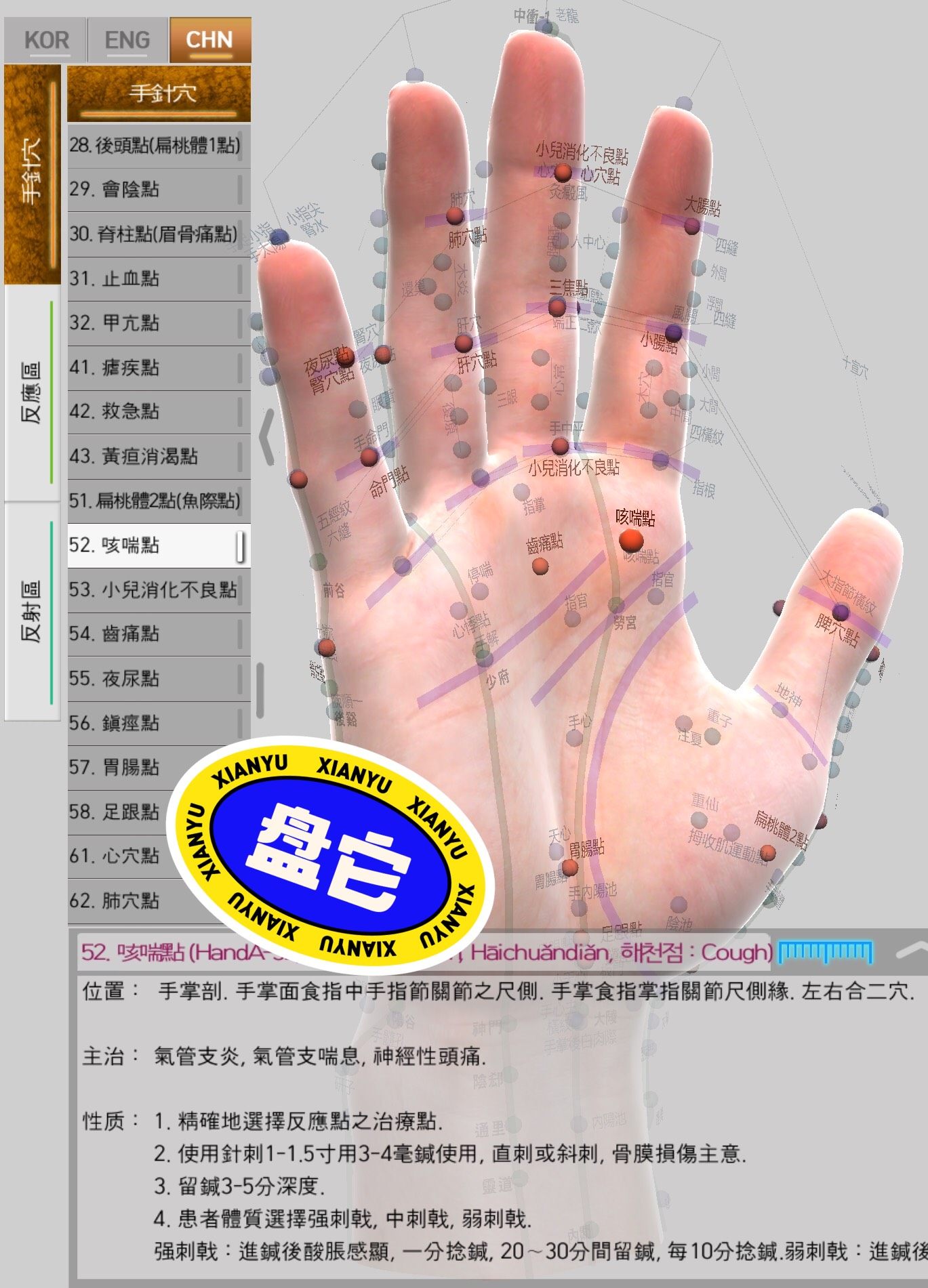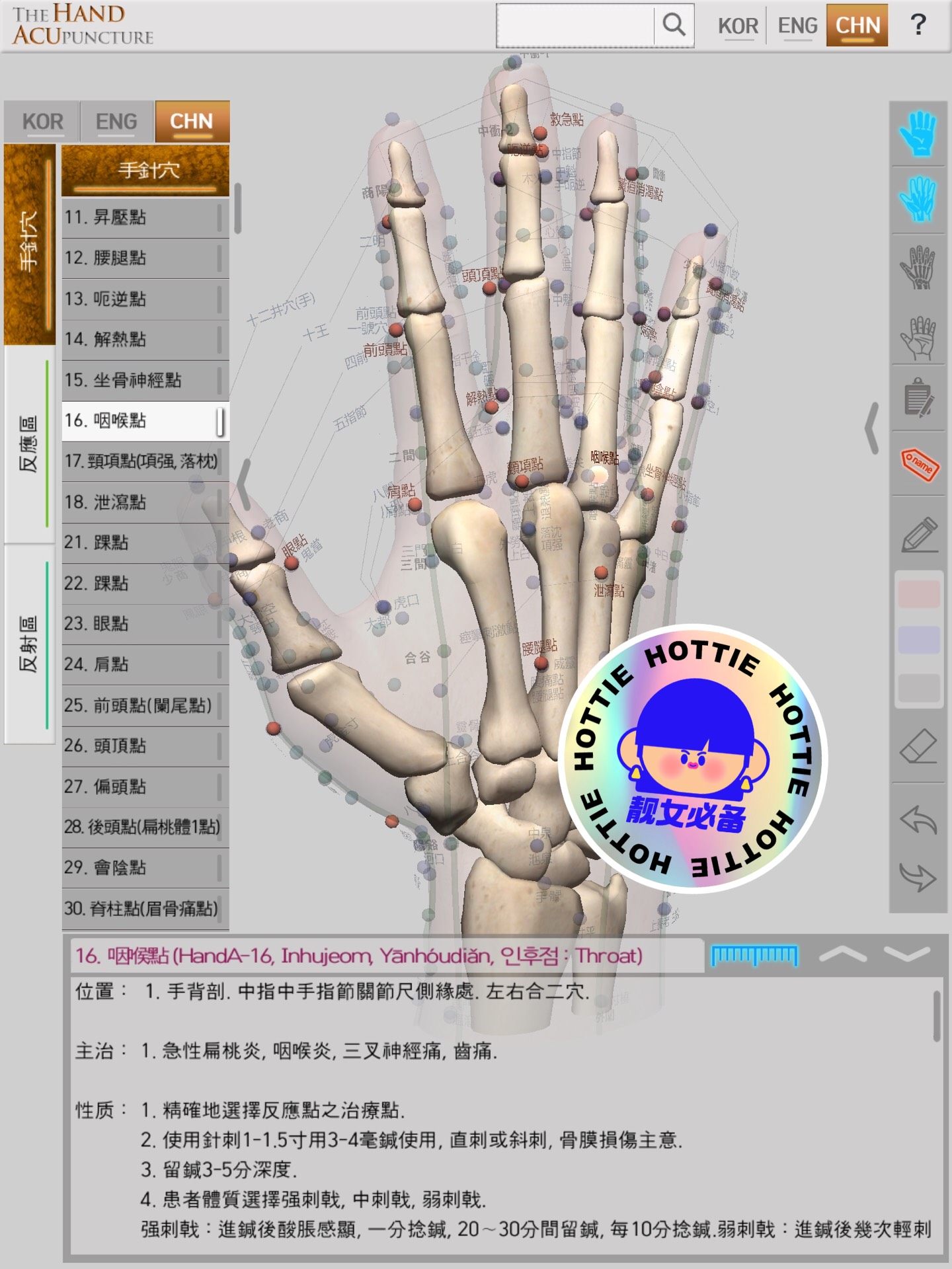 这款专为学习手掌与手背区域设计的应用标注了总共74个精确穴位,并以三维视角呈现给用户。