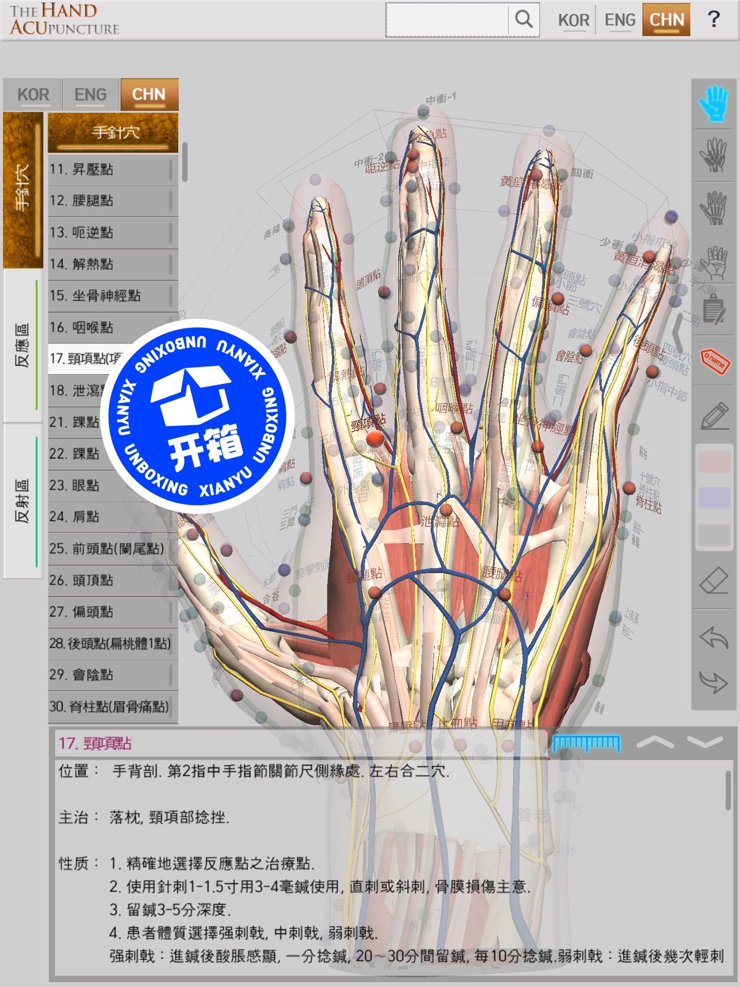 - 底部同样设有隐藏箭头,打开后可以获取关于所选穴位的所有相关信息,包括位置、功效和使用方法。