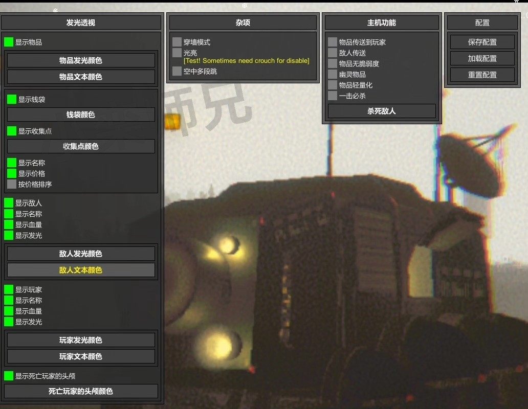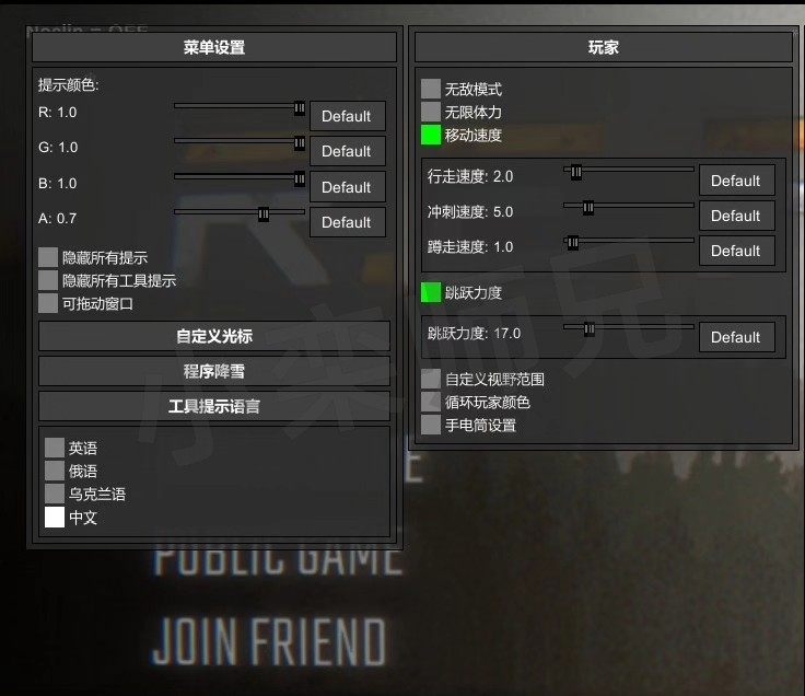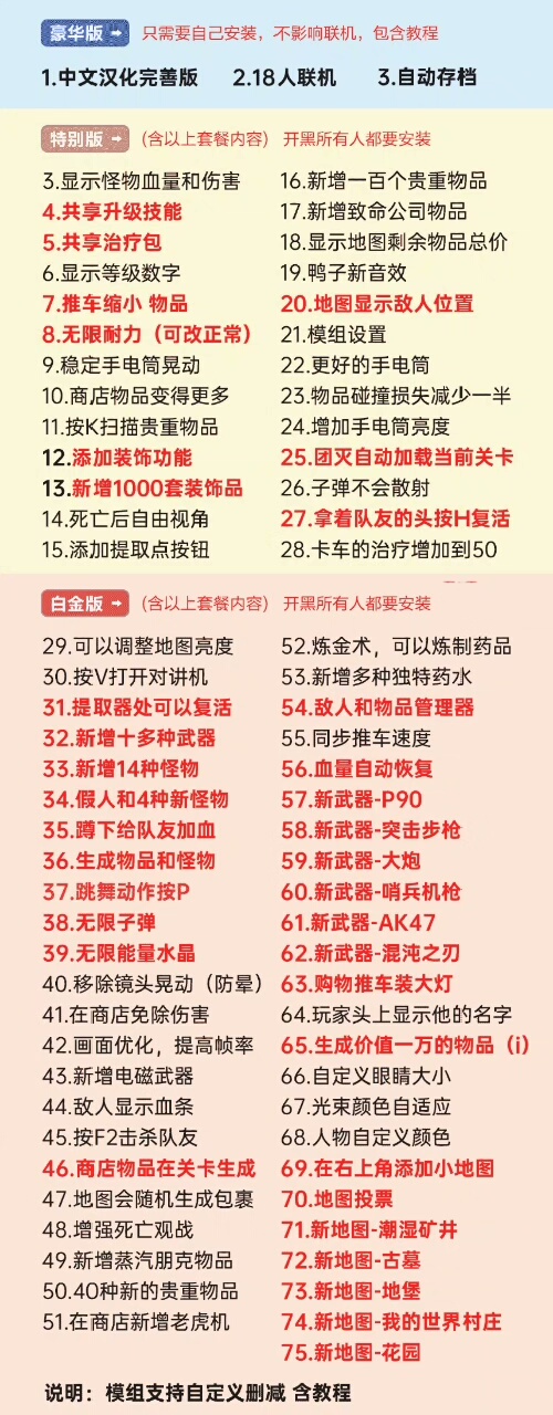 包括但不限于显示剩余生命值、伤害数值以及等级信息;按F键可扫描物品,死亡后通过Z键切换至自由视角;地图上标示队友与对手位置;环境光线强度可调;手电筒亮度增强;消除镜头抖动效果,享受高清视觉体验;设置无限体力选项;蹲下时能够抓取并治疗同伴。