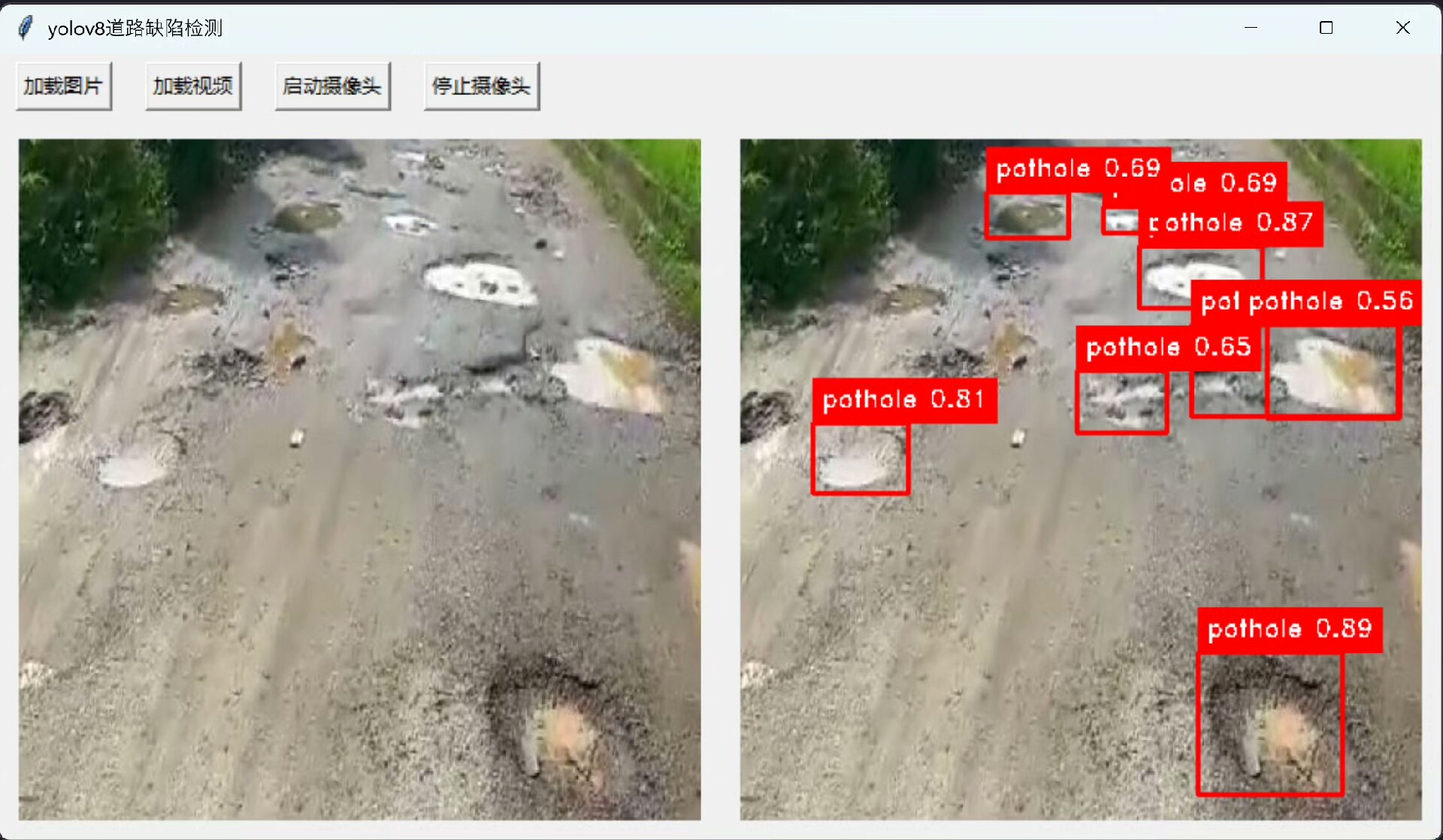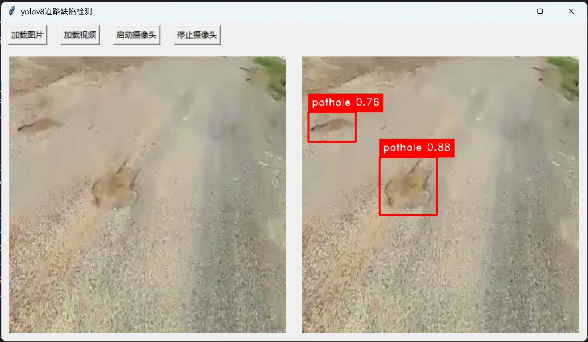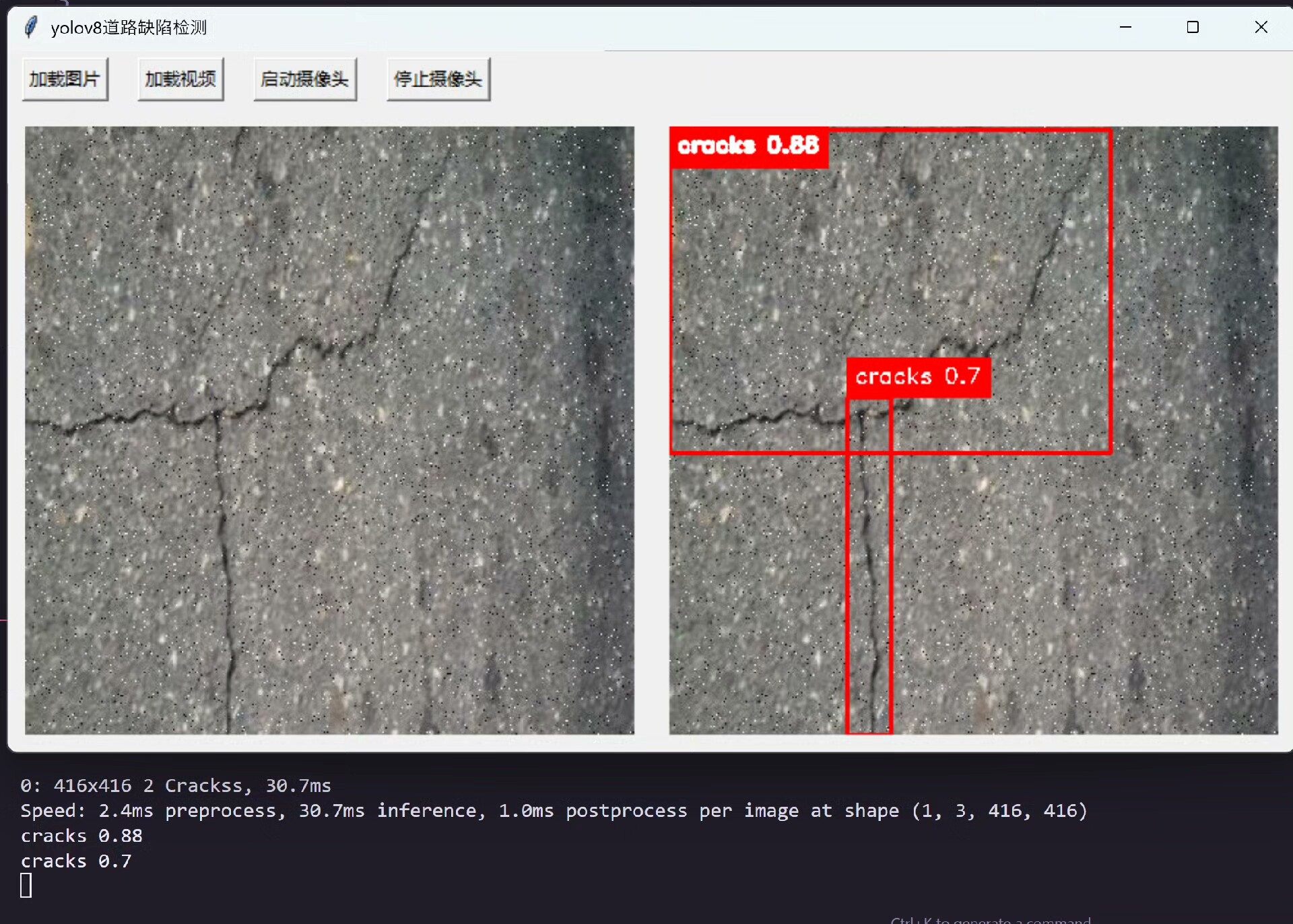 经过精心设计后,本系统能够准确地从给定图像中找出两种最常见的路面问题——裂缝以及坑洼。