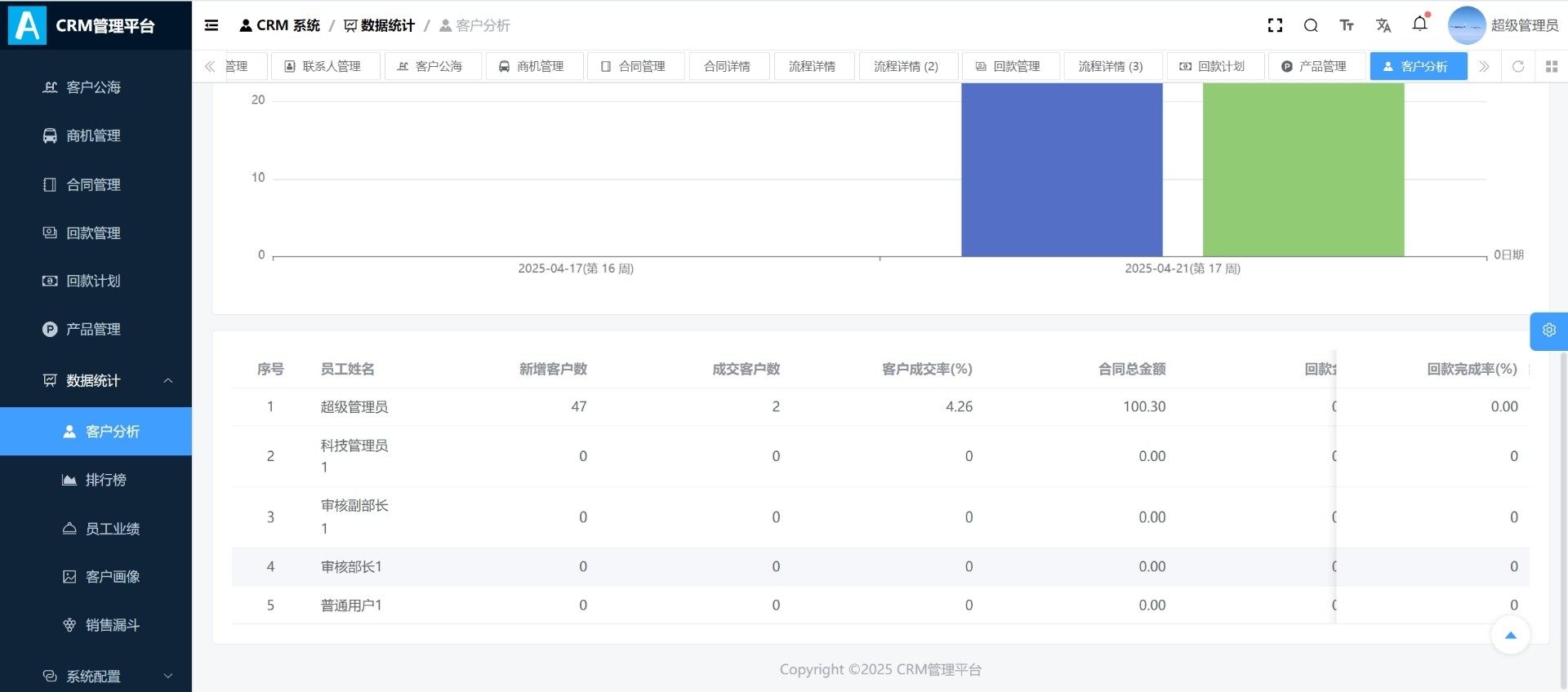 内置强大的数据统计中心,涵盖客户行为分析、销售排行榜、员工绩效评估、客户画像生成以及销售漏斗可视化,帮助企业精准识别高价值客户,优化销售策略。