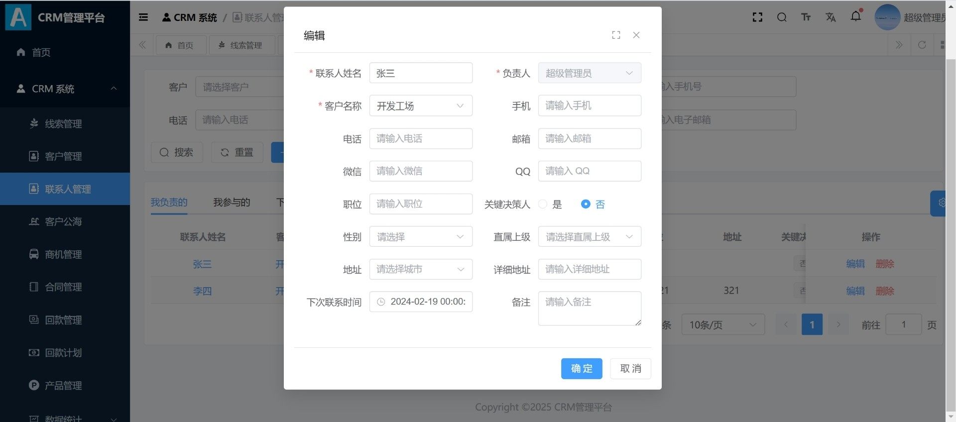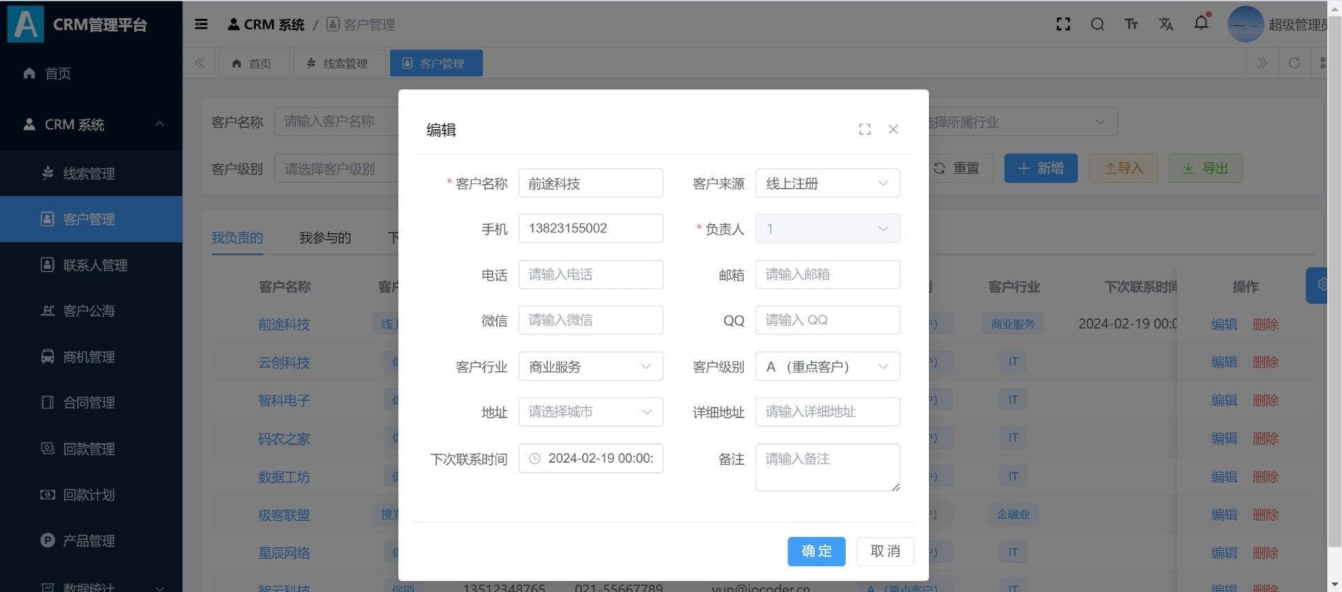 系统已实现完整的CRM核心功能模块,包括线索管理、客户档案维护、联系人信息跟踪、客户公海机制、商机推进流程及合同归档管理。