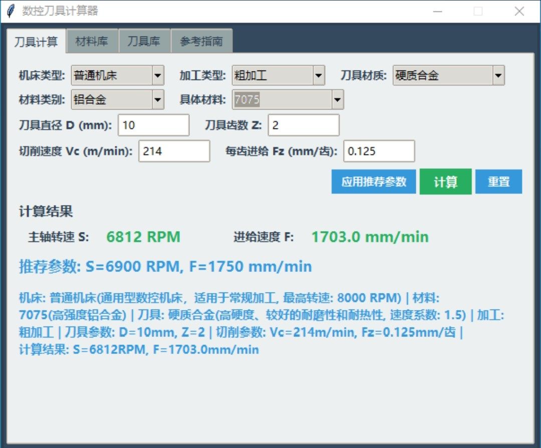当您选择直径为10毫米、拥有两齿的刀具时,并设定切削速度达到每分钟214米,同时每齿进给量为0.125毫米的情况下,该软件将根据这些条件为您计算出最合适的加工参数。