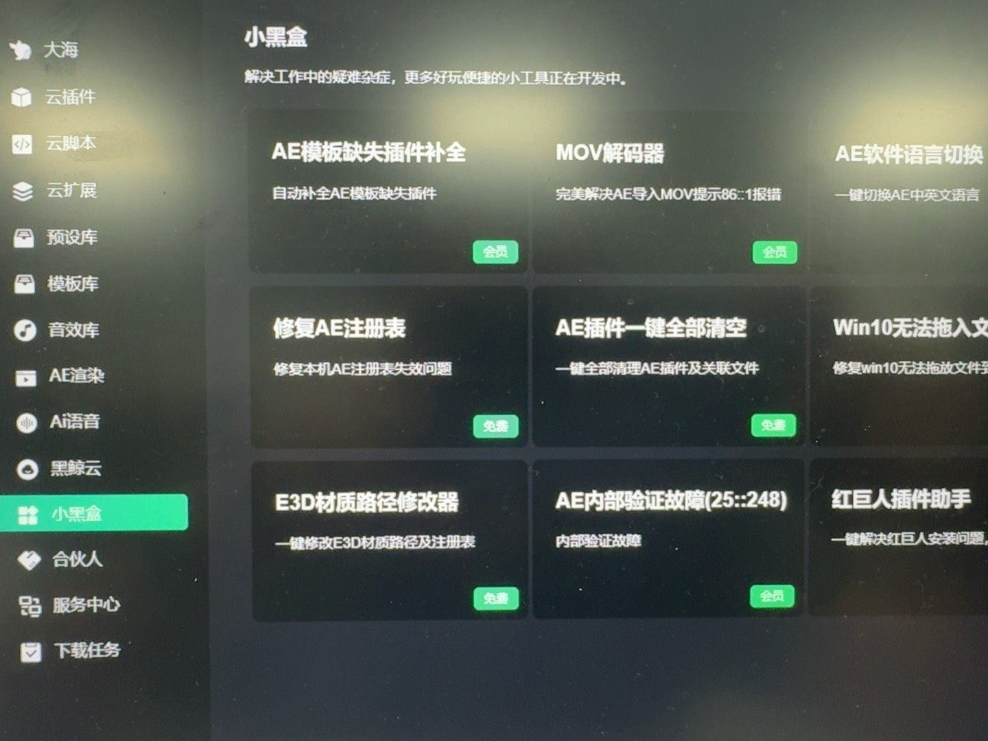 AE/PR黑鲸工具箱就是这样一款神器,它不仅能够帮助您快速安装各种插件、素材以及音效,还能在遇到问题时通过简单的点击完成修复。