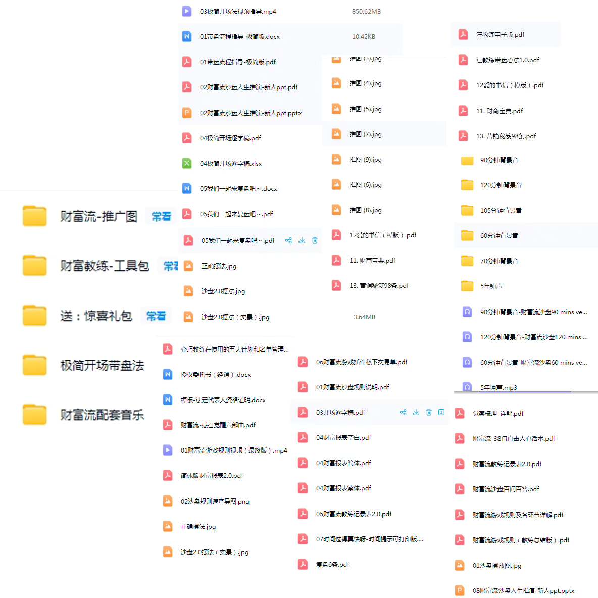 此部分详细介绍了一套完整的财富流沙盘教学资源,包括但不限于PPT形式的教学材料、详细的开场白脚本、常见问题解答手册以及用于记录推演过程的各种表格。
