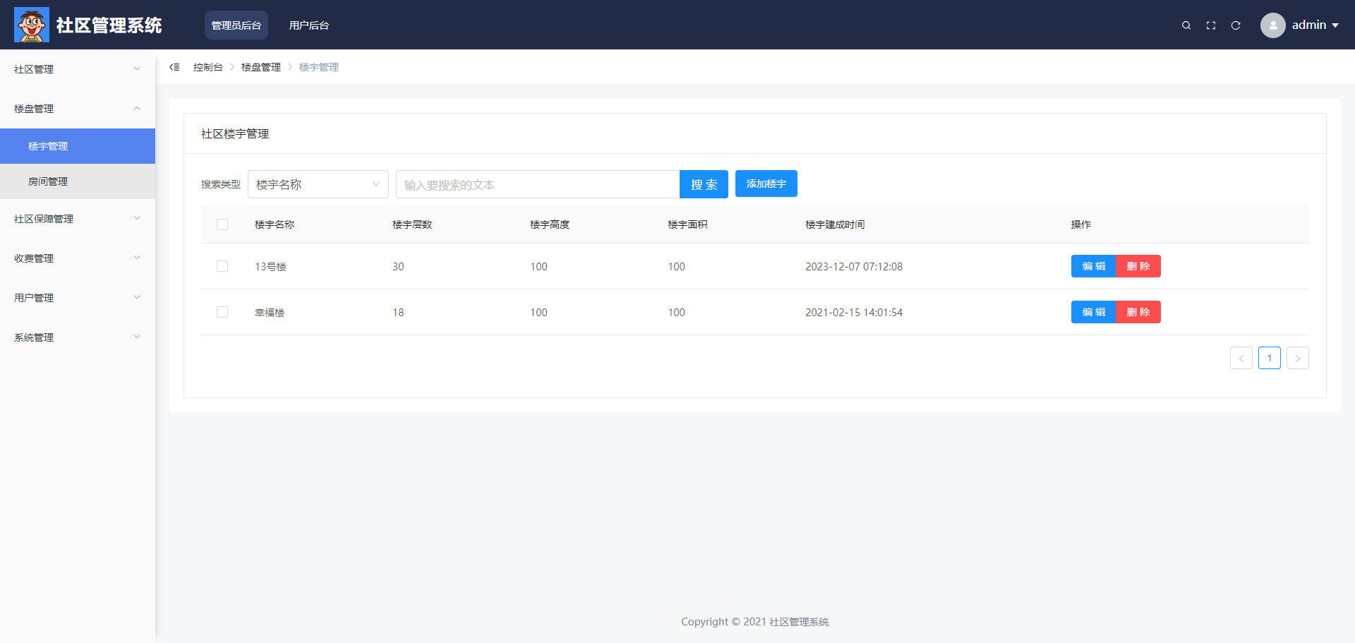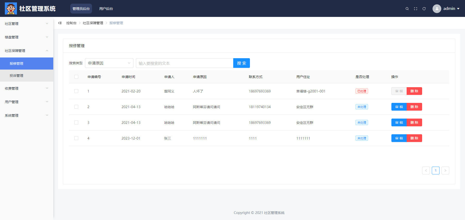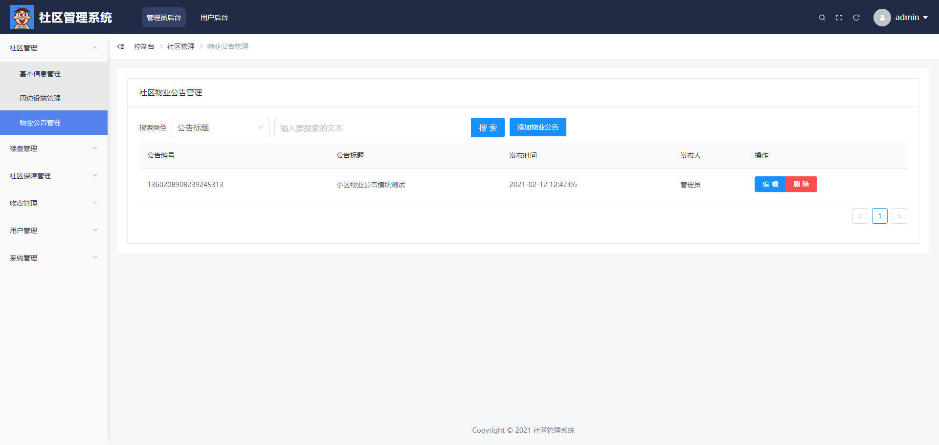 系统主要分为两大用户角色:业主和管理员,各自具备独立的操作权限与业务流程。
