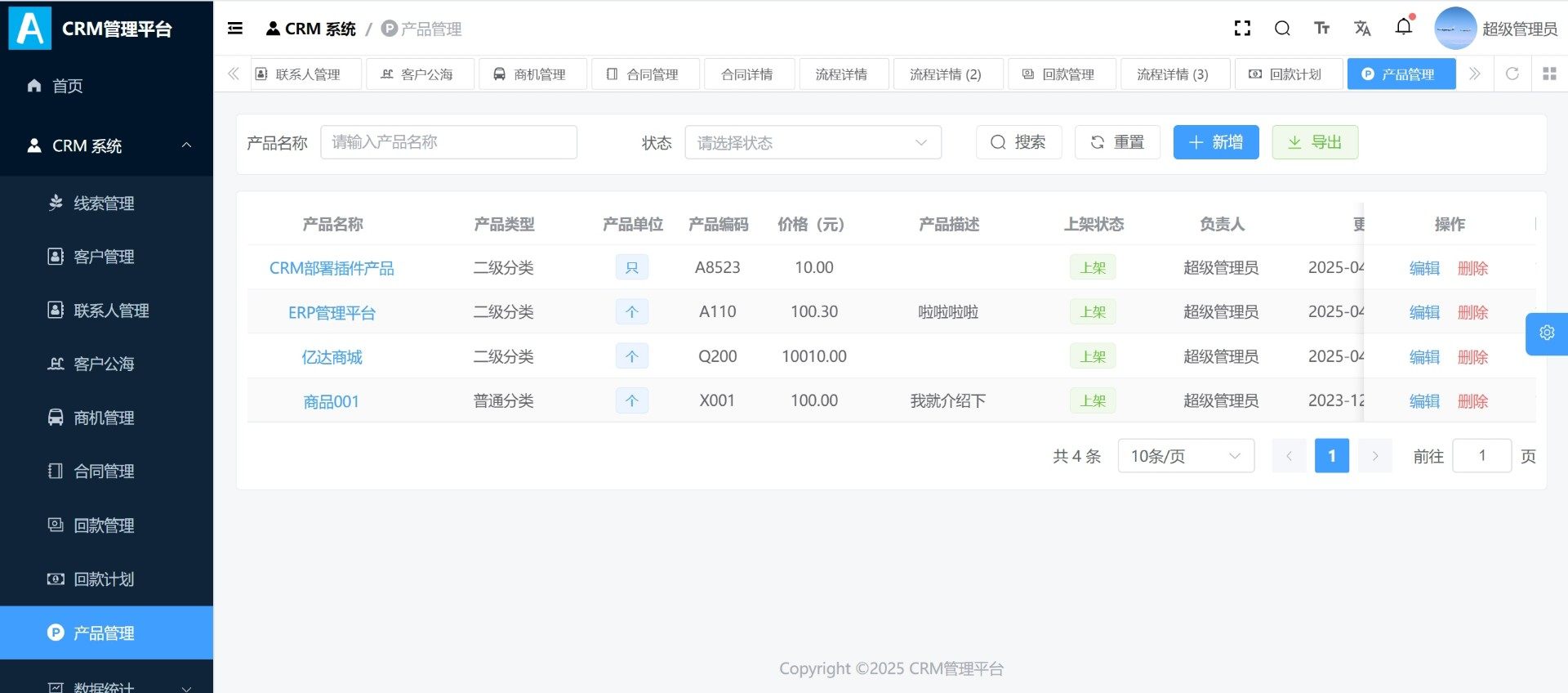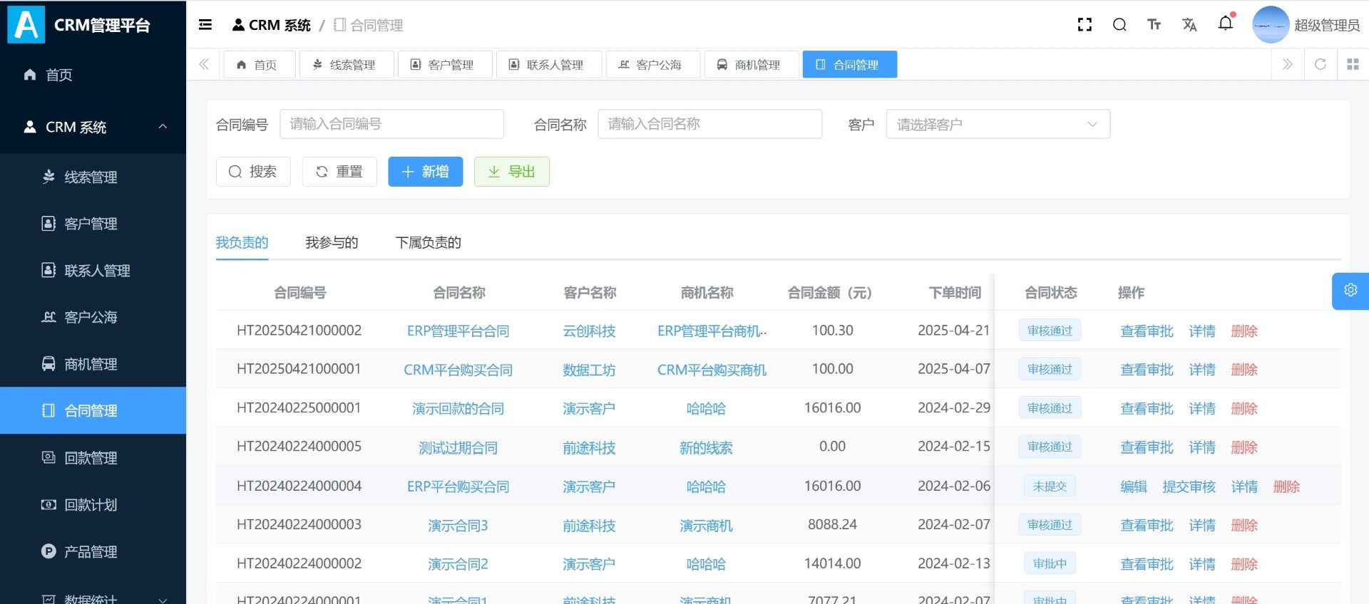 本套CRM系统源码基于现代化技术架构开发,支持完整客户生命周期管理,涵盖线索转化、客户跟进、商机推进、合同签署及回款计划等核心业务流程。