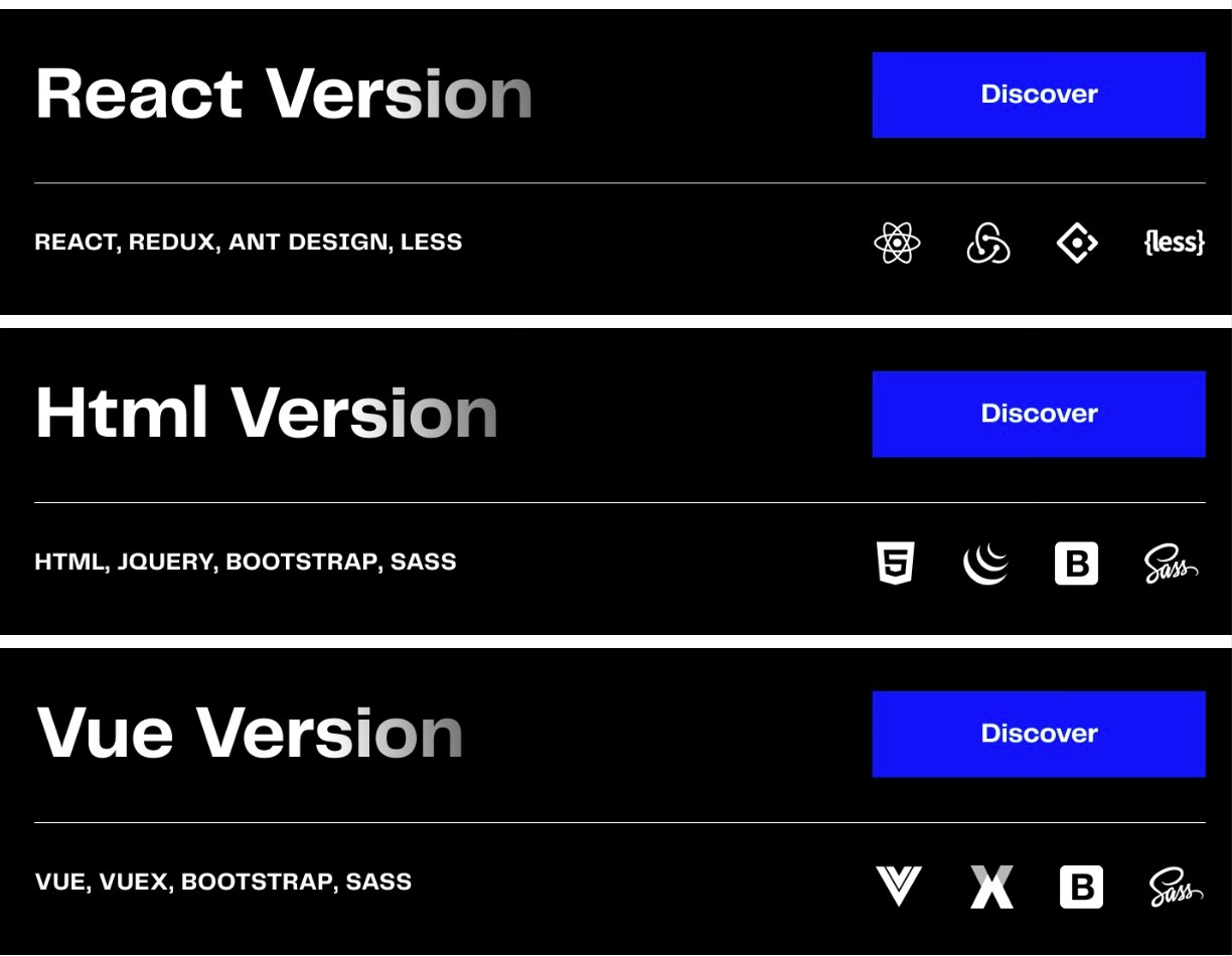 该模板提供 React、Vue 和 HTML 三个独立版本,满足不同开发团队的技术需求。