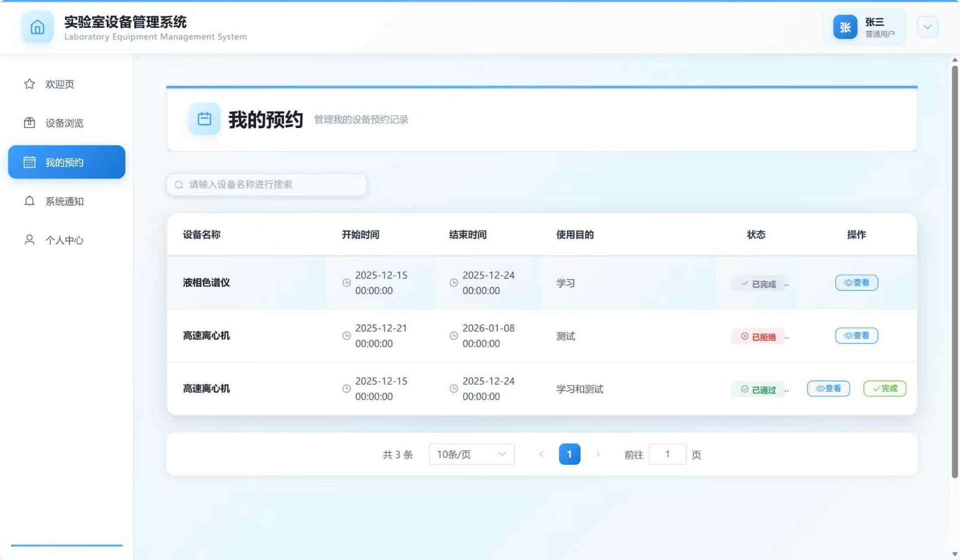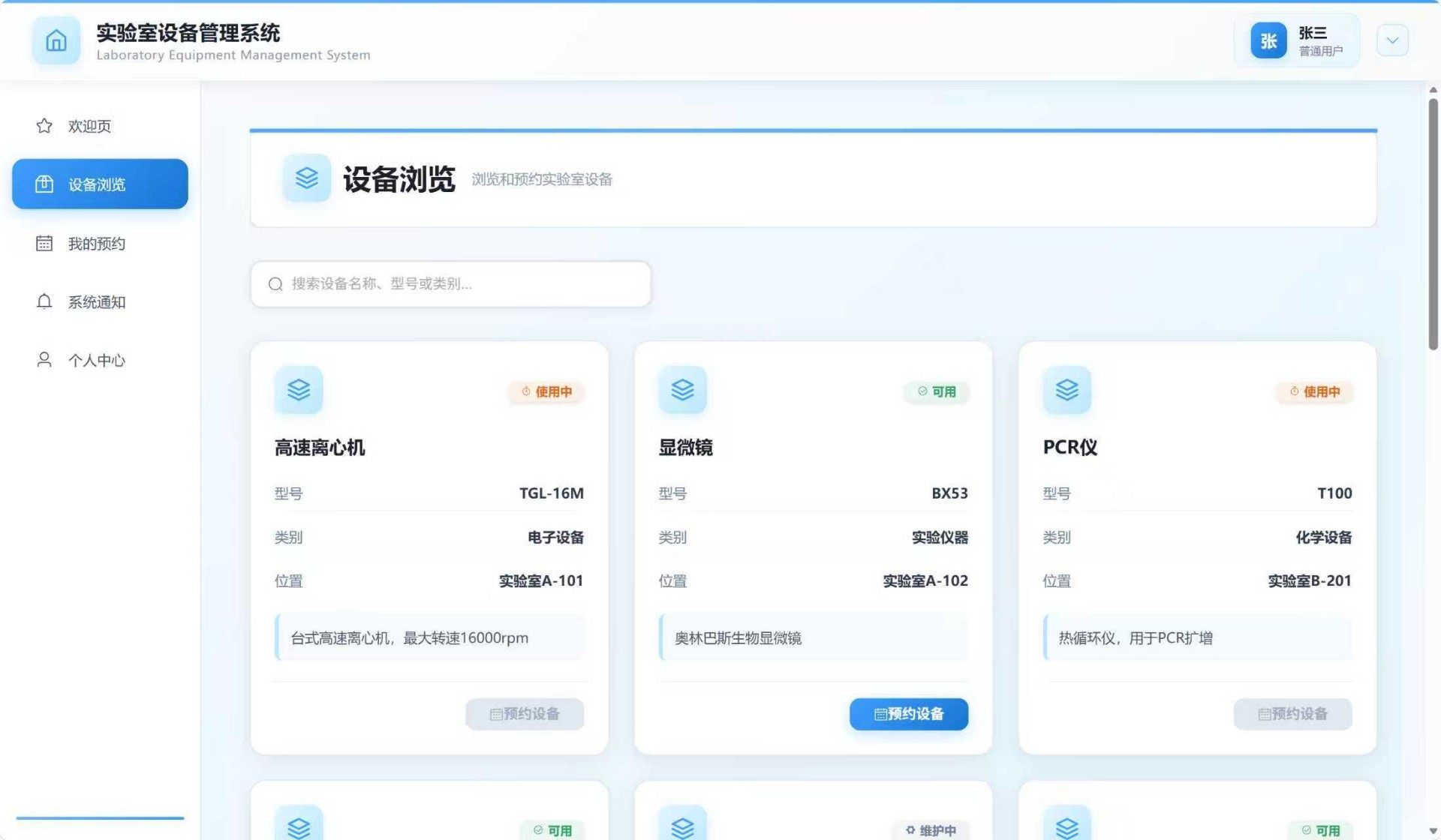 特别说明:设备预约逻辑为:用户预约成功后设备状态变更为“使用中”,任务完成后恢复为“正常”状态,其他用户即可继续预约。