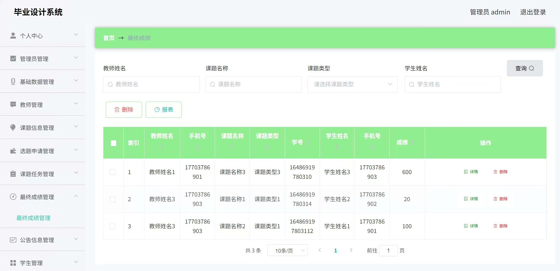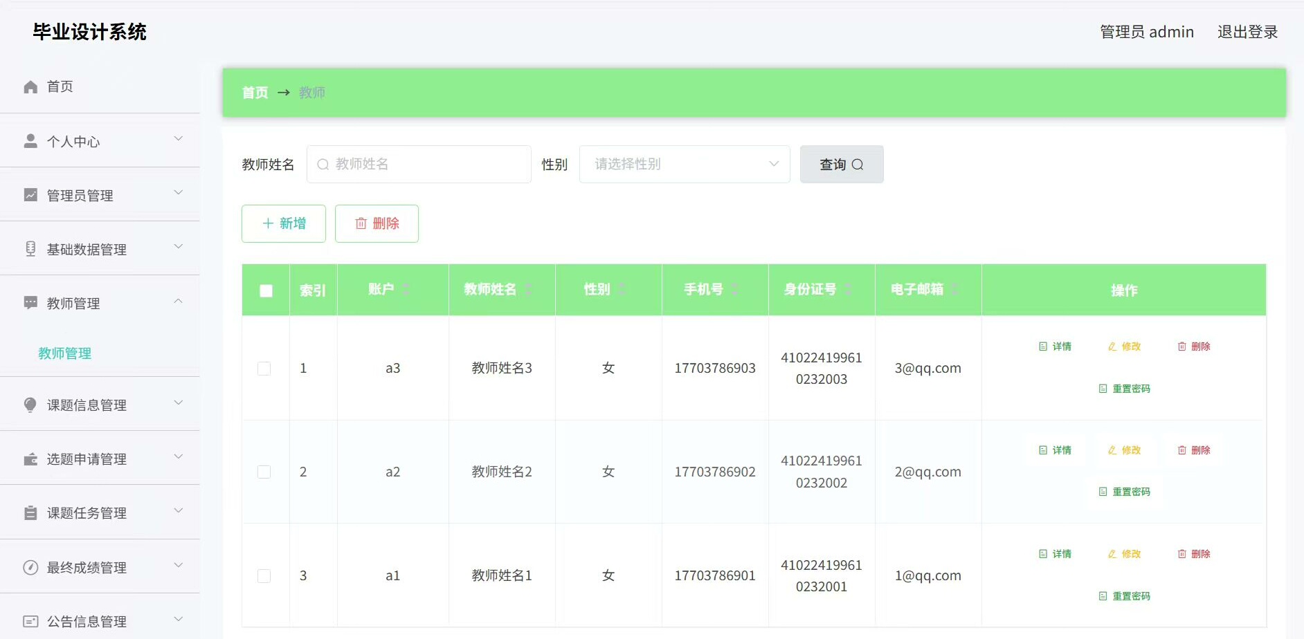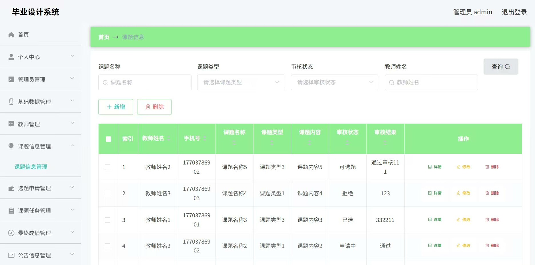 系统为管理员提供全面的后台管理能力,包括用户账号管理、教师信息维护、学生资料录入、公告发布以及基础数据字典配置(如学院、班级、课题类型等)。