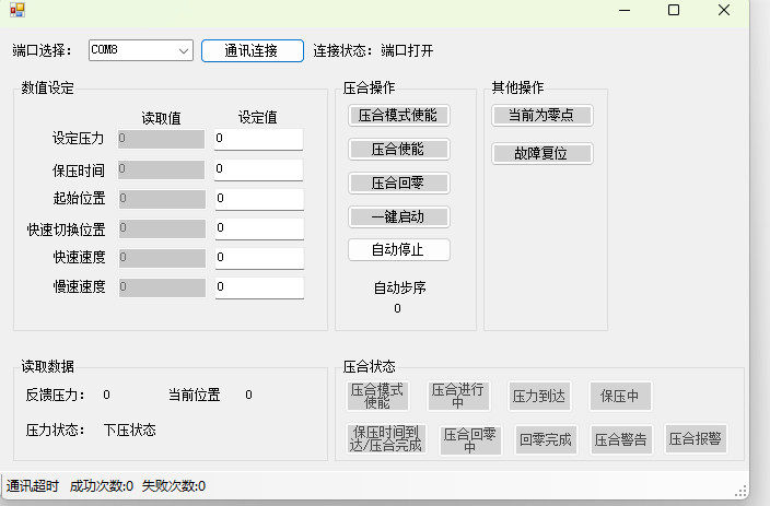 主界面集成多项关键参数设置功能,包括目标压力值设定、保压时长控制、起始位置定义、快速移动位置切换、快慢运行速度调节等,满足复杂工艺需求,提升设备响应精度。