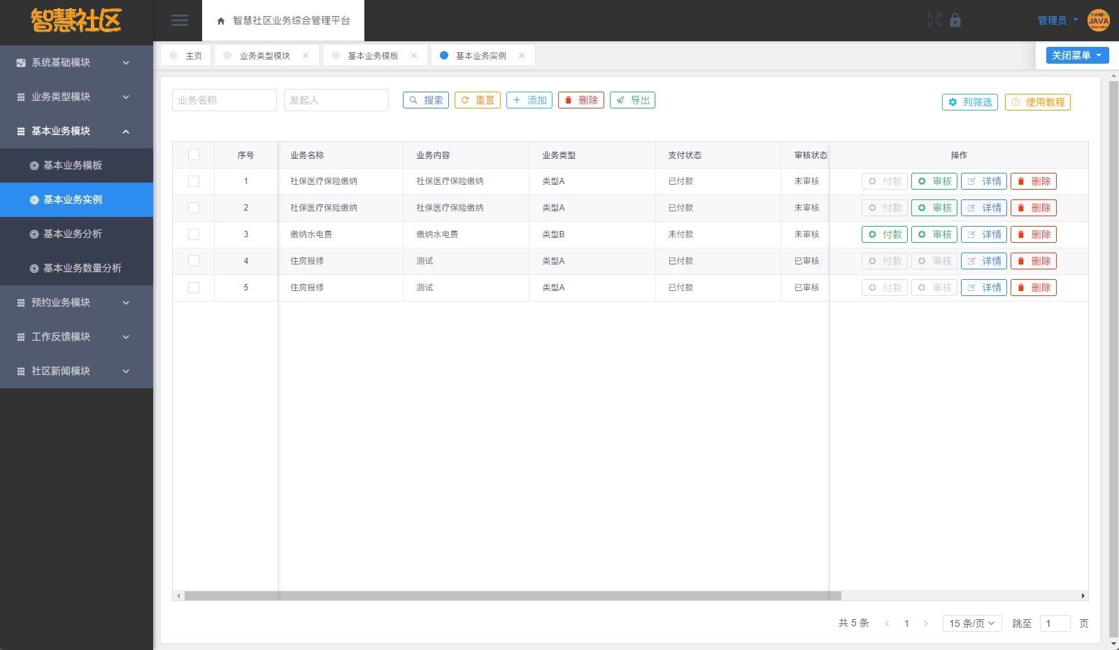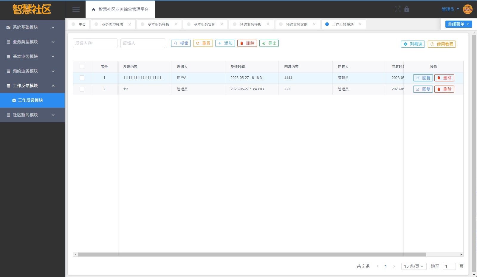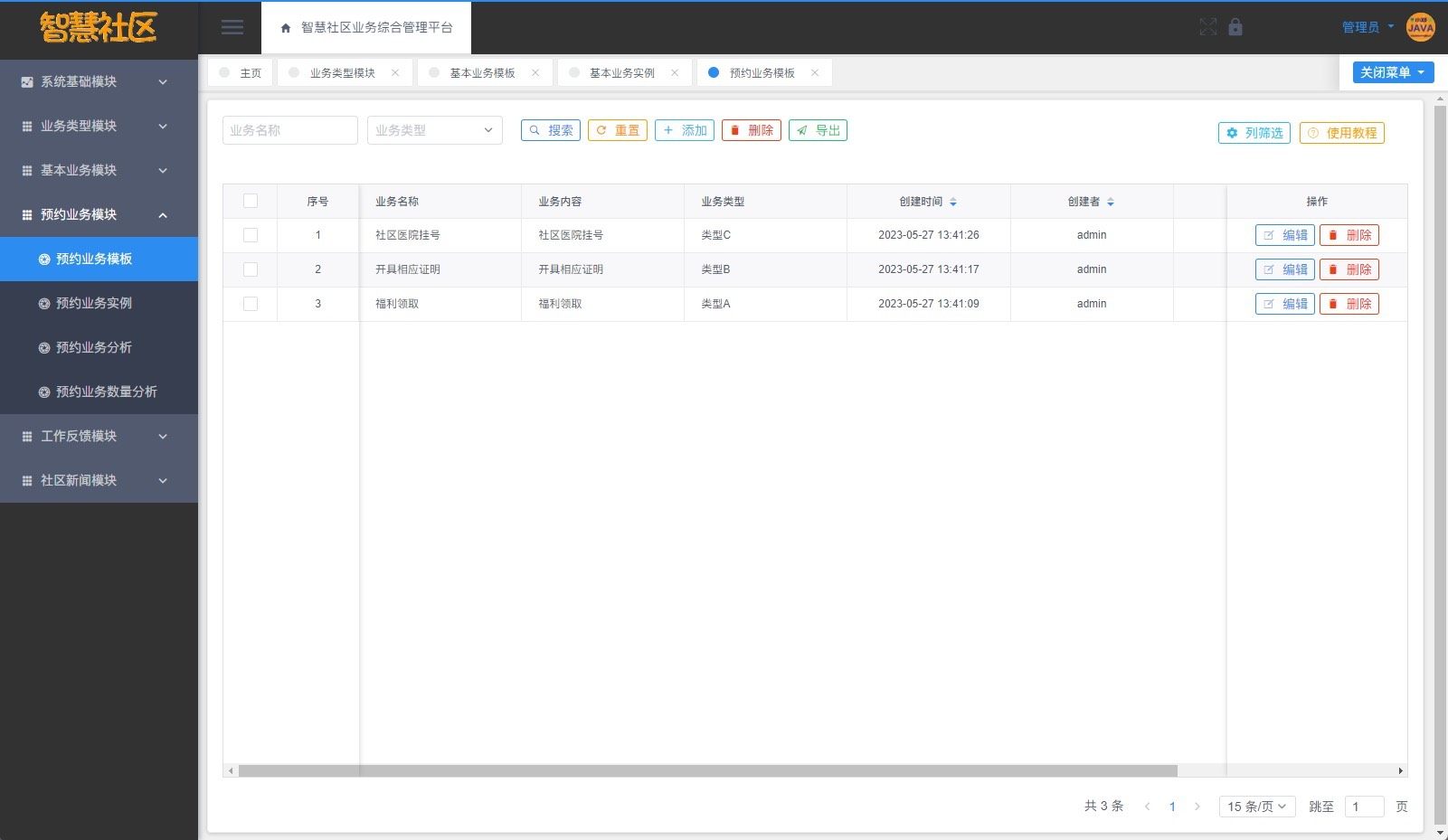 平台涵盖六大核心业务模块:业务类型管理、基础业务处理、线上预约服务、业务数据分析、工作反馈机制以及社区新闻发布。