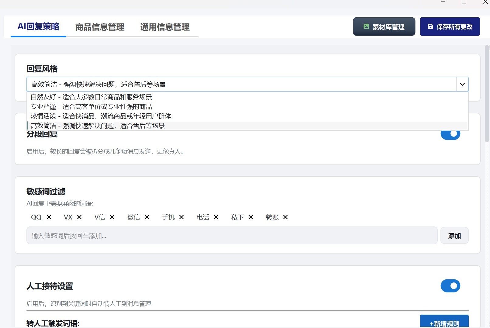 支持灵活配置回复风格,满足不同品牌调性需求;同时配备敏感词过滤机制,有效防范违规风险,确保对话内容合规可控。