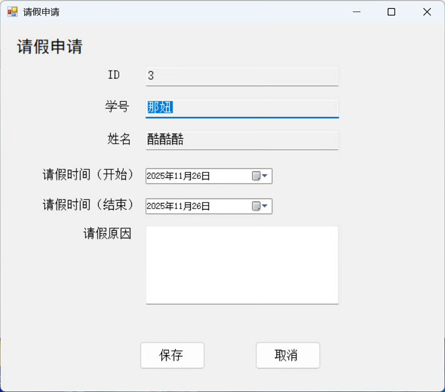 学生用户可在线填写并提交请假申请,需如实填报请假原因、起止日期等必要信息,系统自动保存并推送至管理员待审列表。