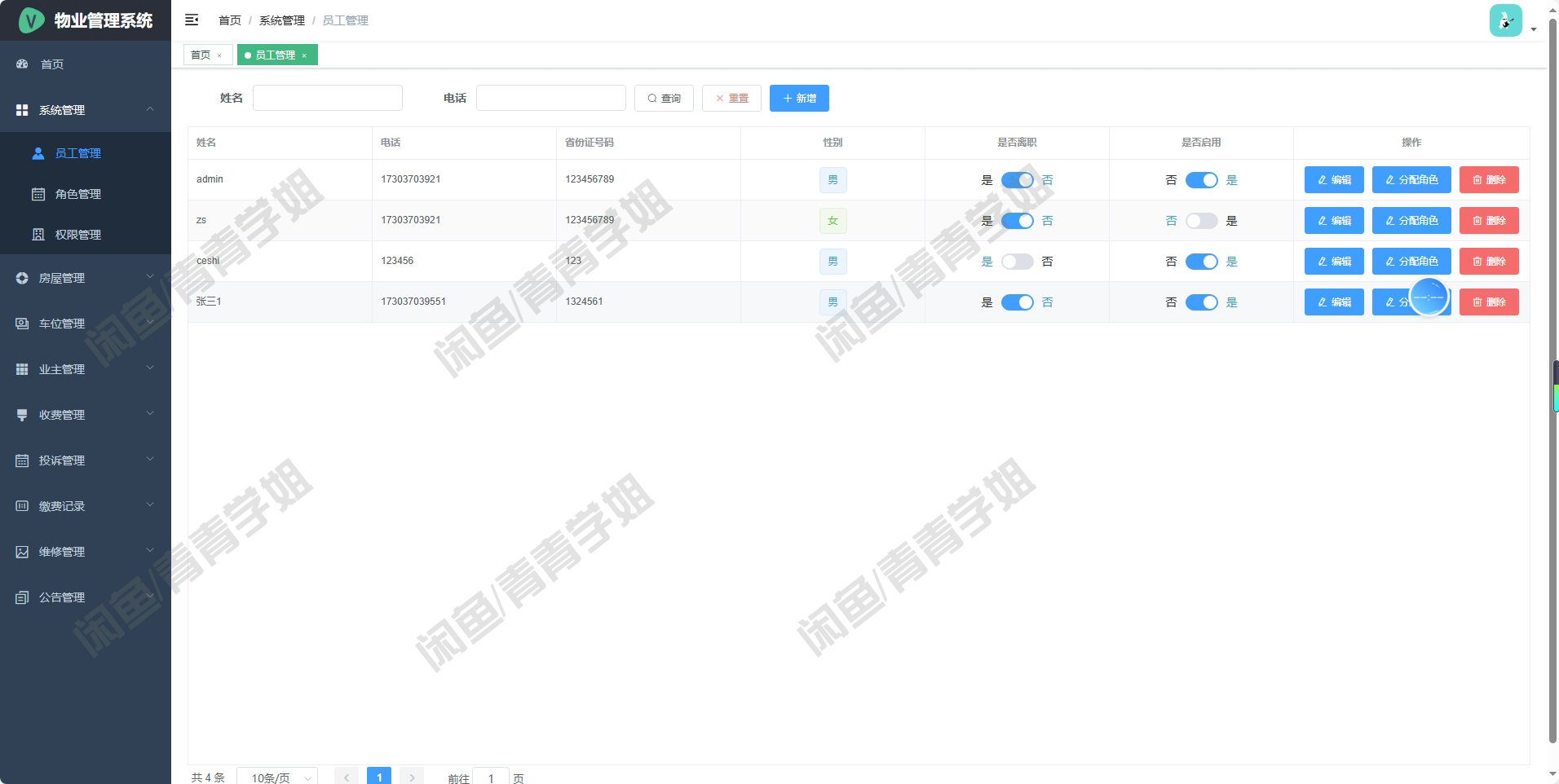 管理员账户为admin / 123456,可用于配置全局设置;普通用户示例为zhangsan / 123456,用于模拟业主操作流程。