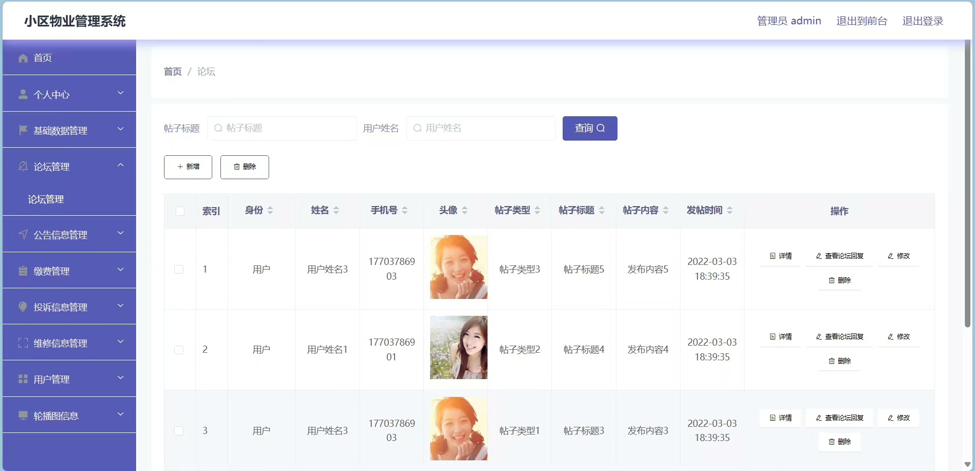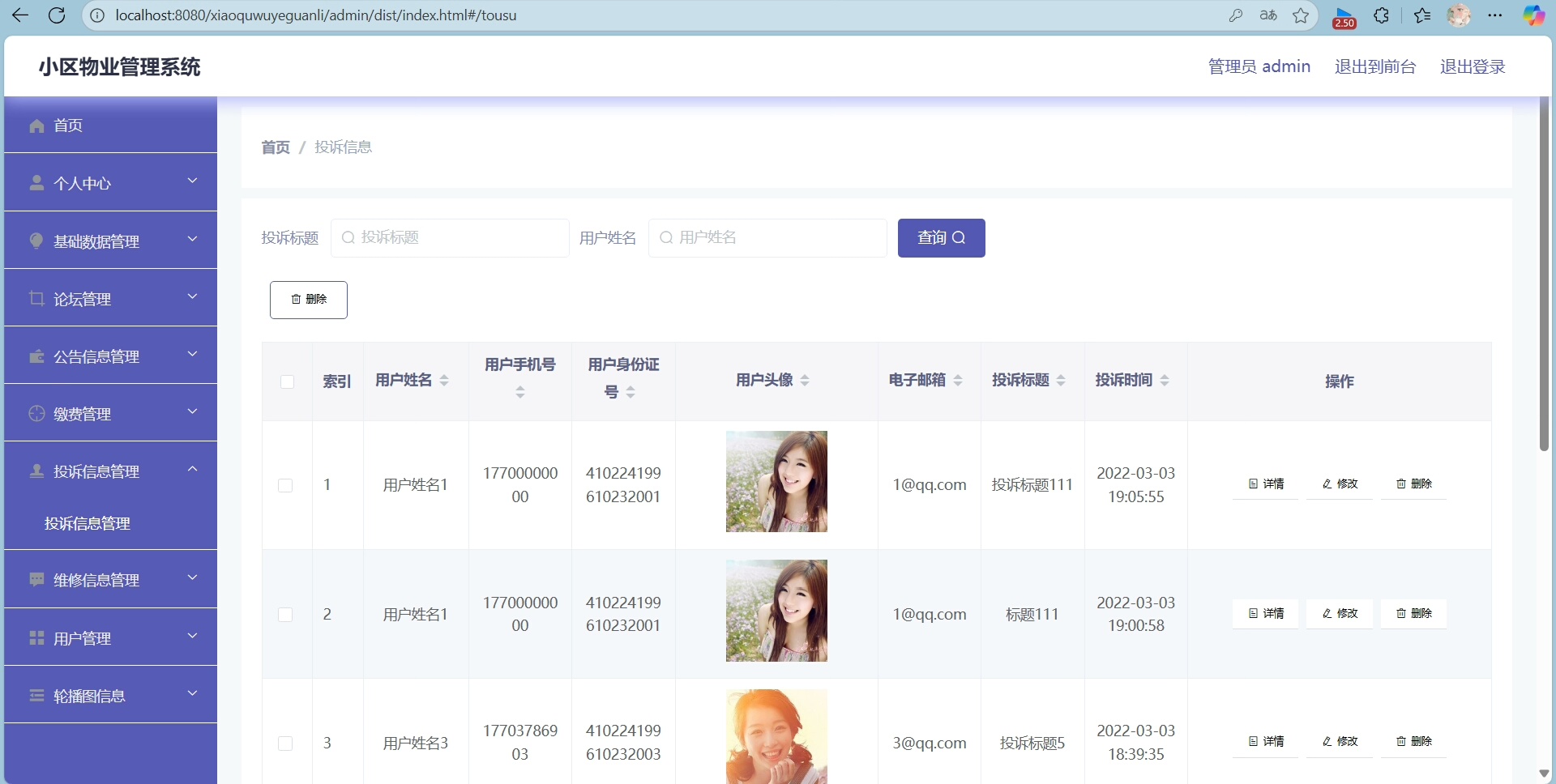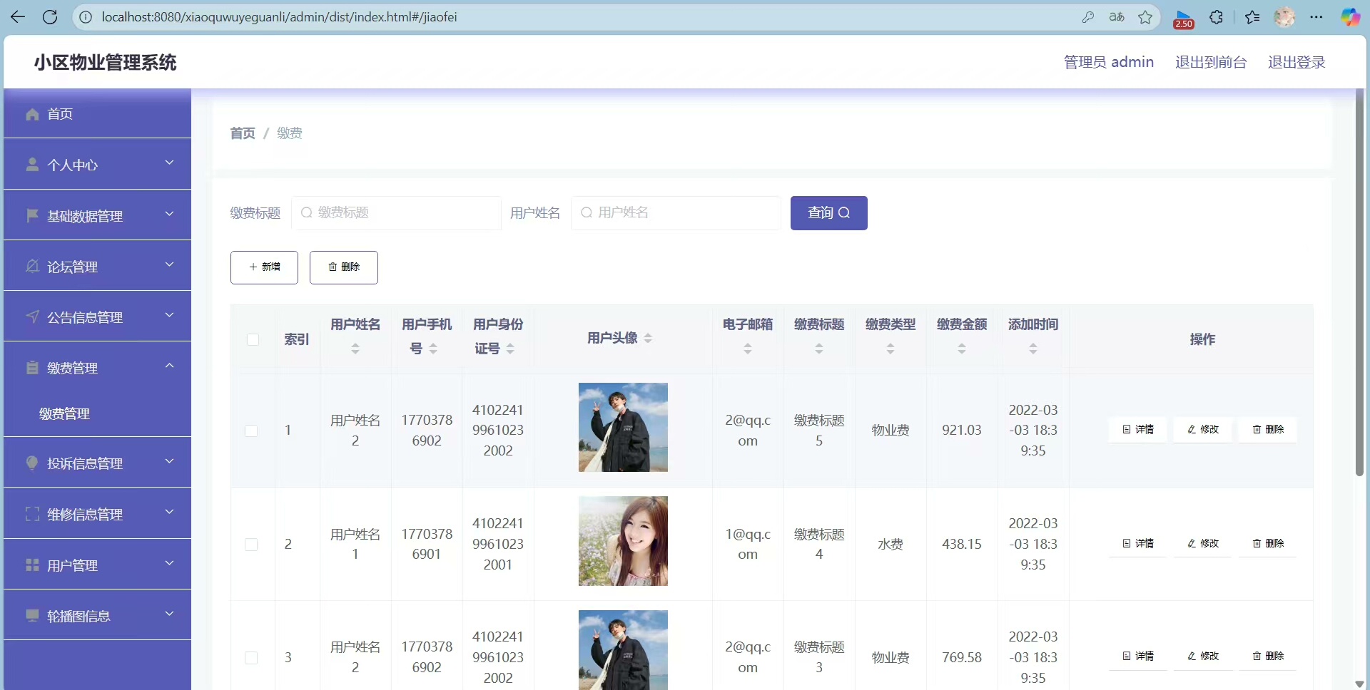 管理员可进入后台对所有数据进行增删改查操作,包括业主信息、安保记录、物业费用、公告通知等内容均可灵活编辑。