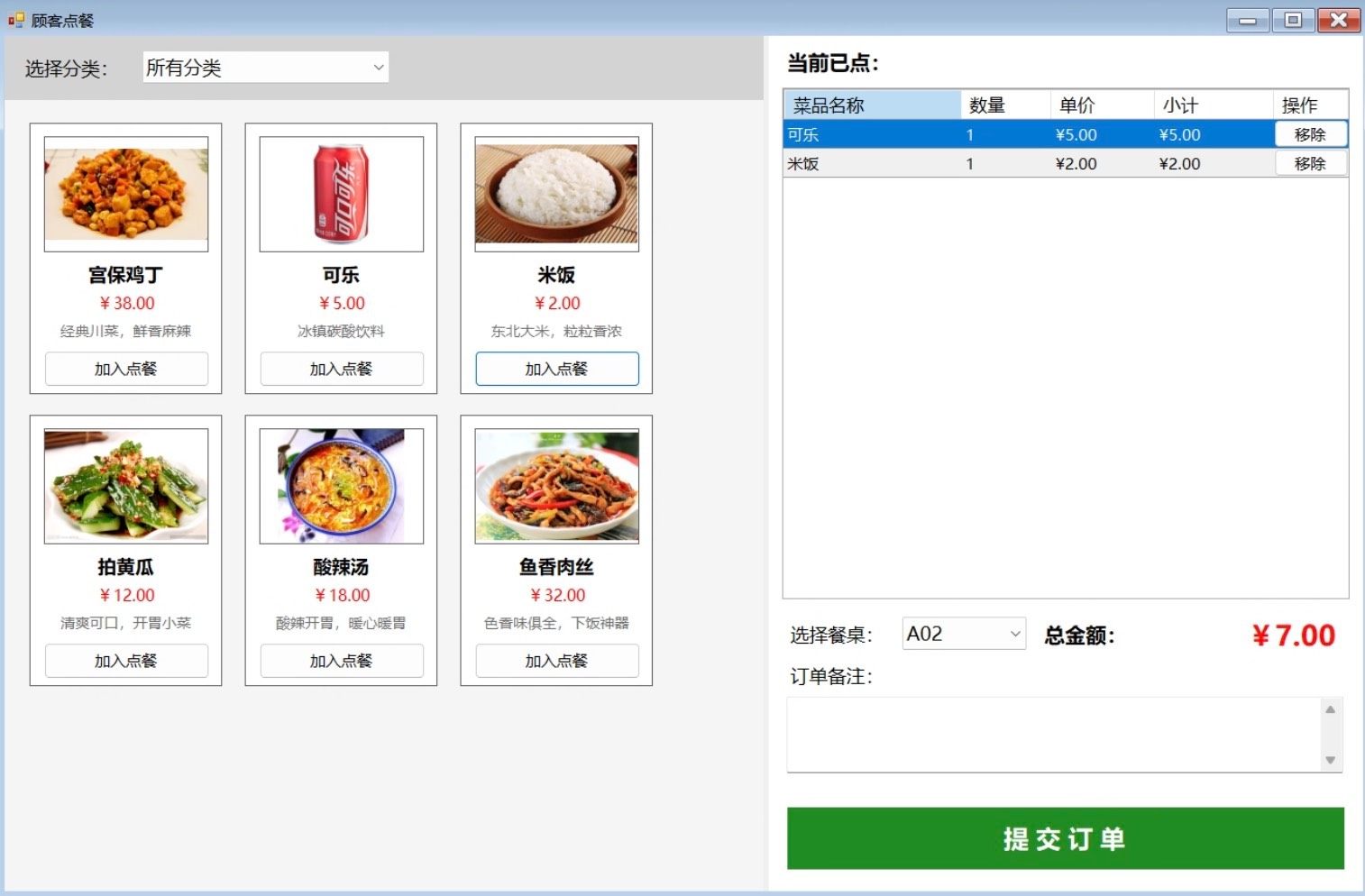 顾客登录后可浏览全部菜品列表,支持图片展示与价格显示,选择所需菜品加入订单,实时查看购物车内容并提交下单。